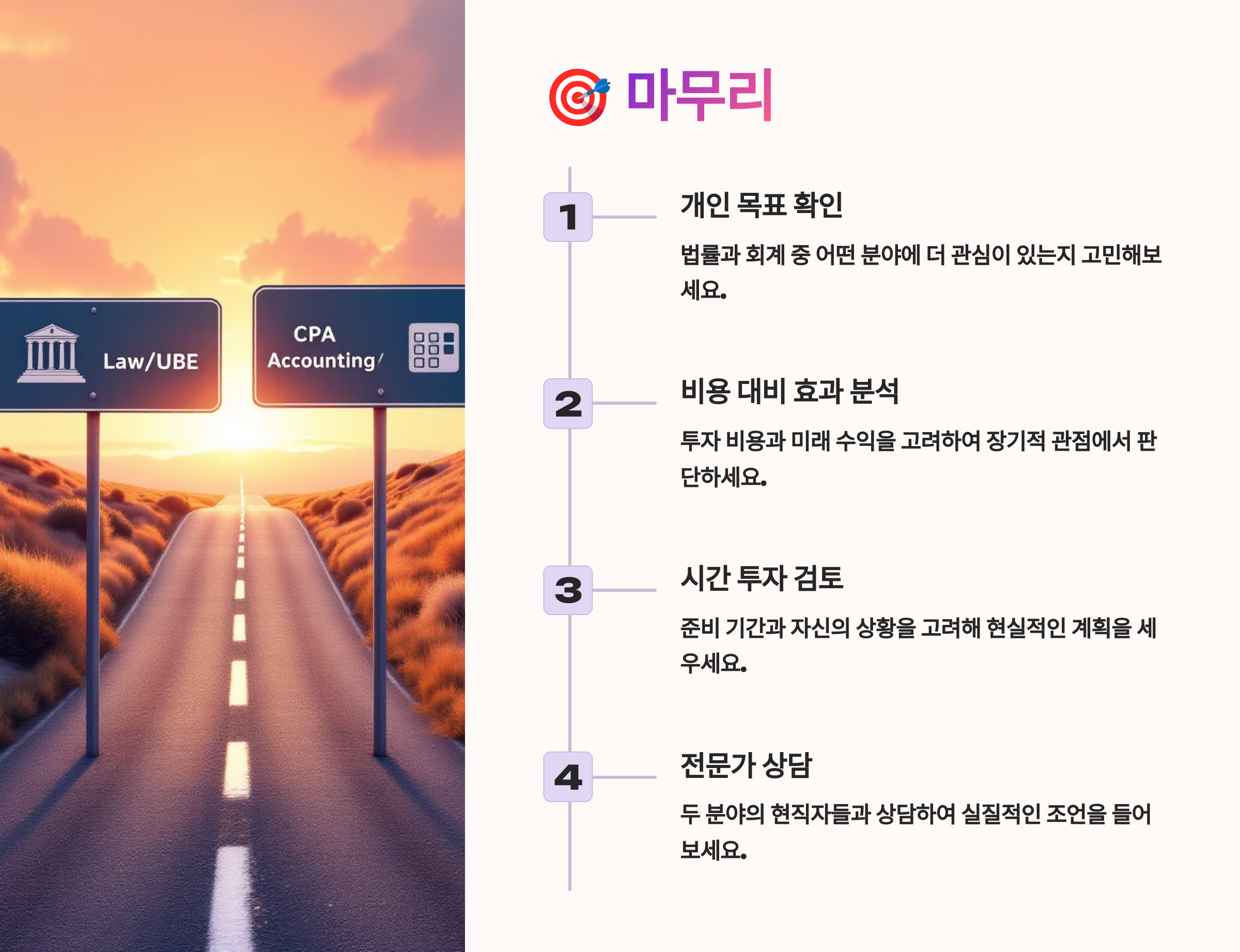 미국 변호사 시험(UBE)과 CPA(공인회계사) 시험은 각각 법률과 회계라는 전문적인 분야에서 높은 가치를 가지는 자격증이에요. 하지만 시험 방식, 비용, 합격 후 진로가 다르기 때문에 신중한 선택이 필요해요. 🤔