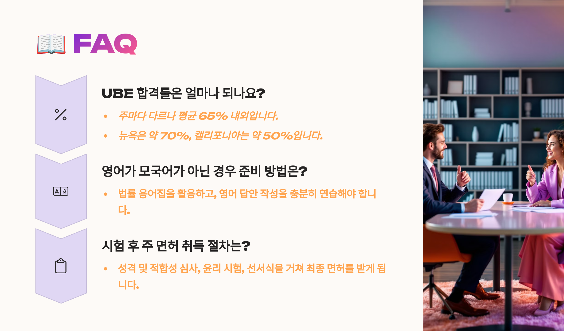 A5. 아니요! UBE 합격 후 변호사 등록(State Bar Admission) 절차를 거쳐야 해요. 보통 MPRE(윤리시험), 배경 조사, 면접 등이 포함돼요. 🏢