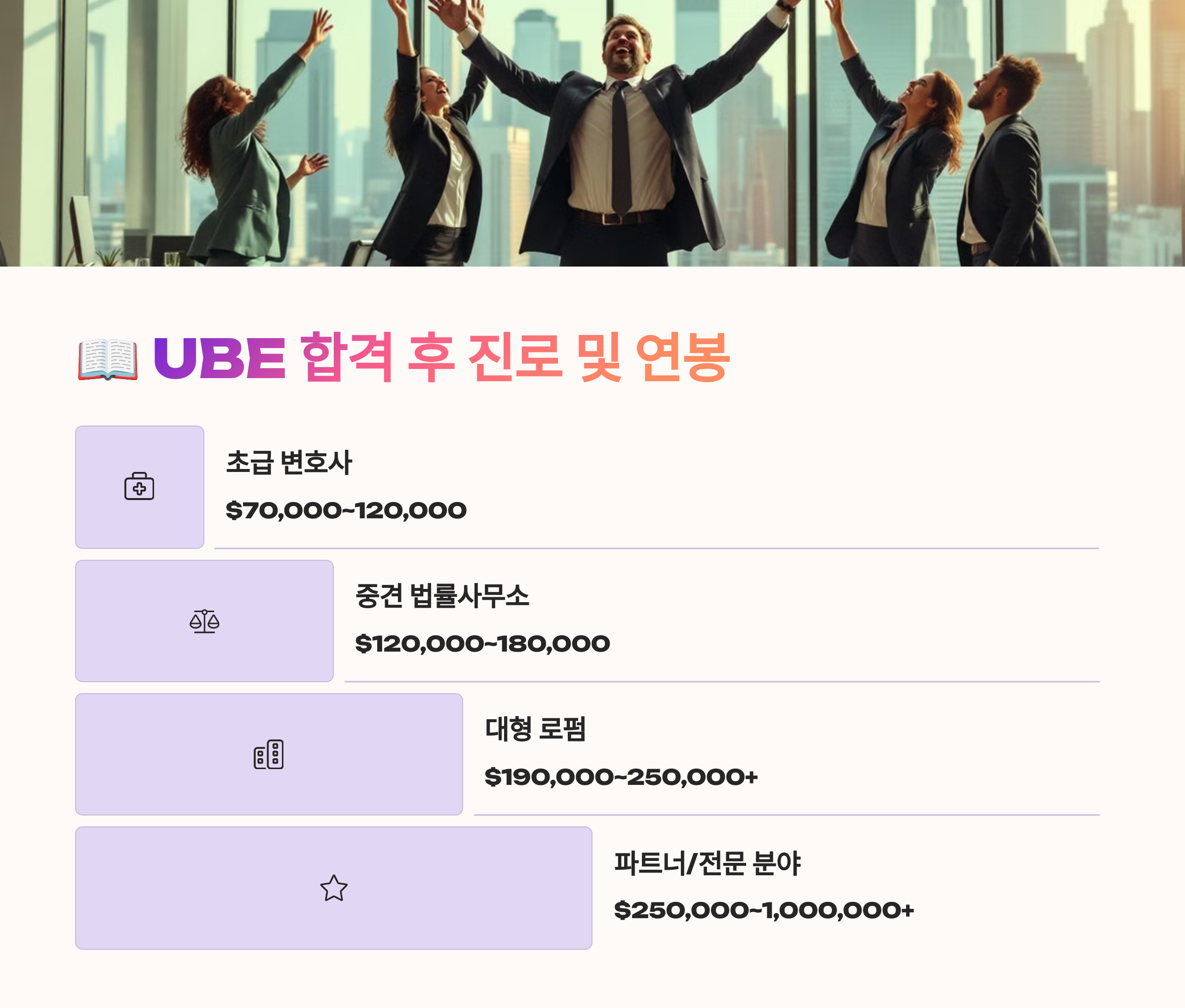 UBE에 합격하면 미국 변호사(Lawyer)로서 다양한 분야에서 활동할 수 있어요. 하지만 변호사 등록(State Bar Admission)을 해야 정식으로 일할 수 있답니다! ⚖️