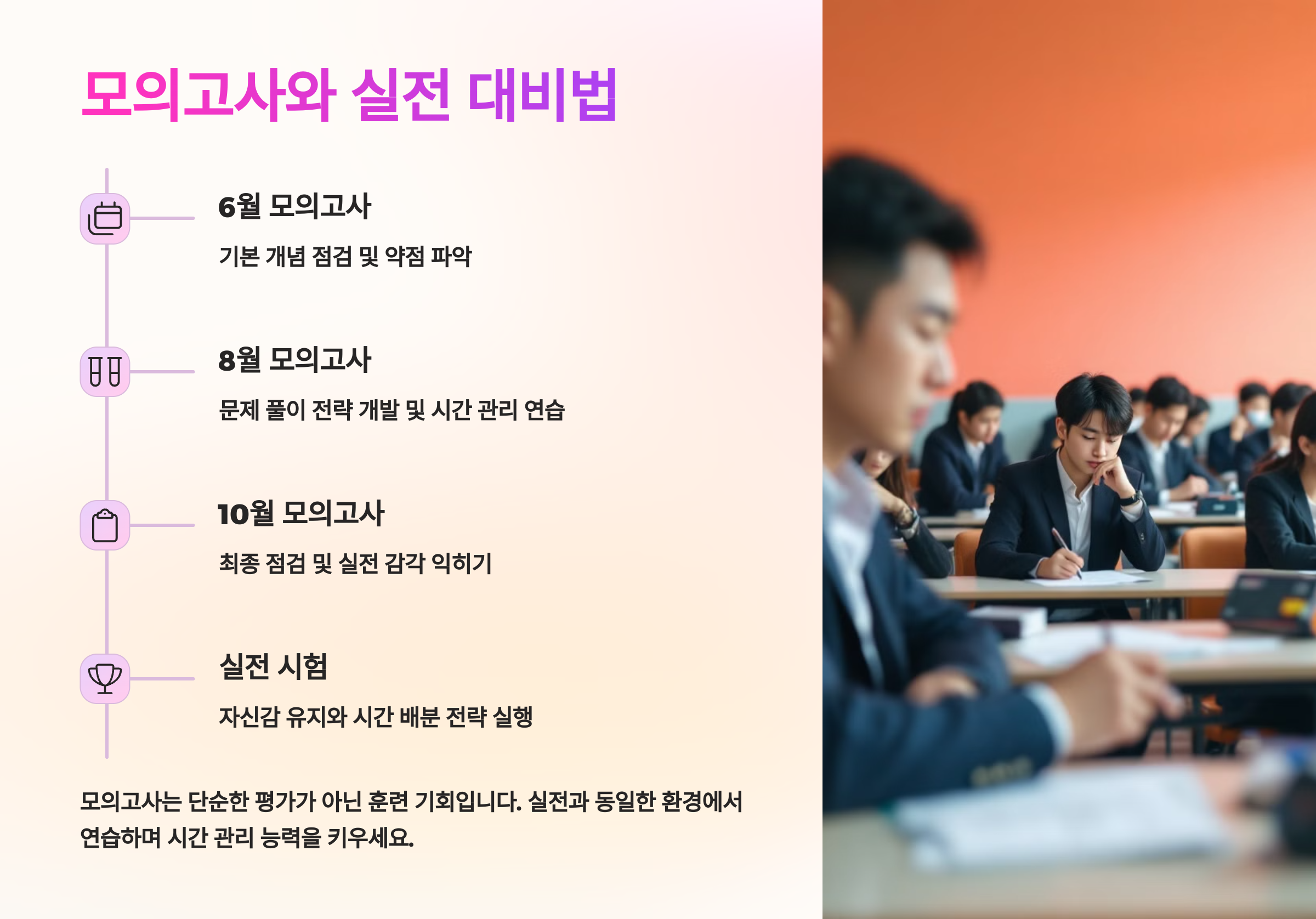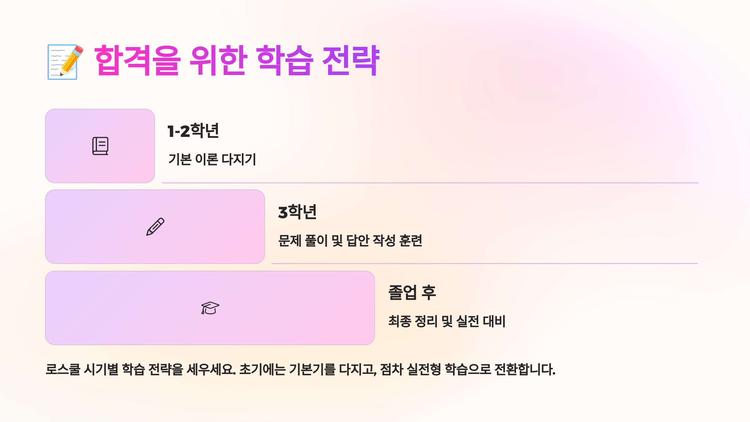📖 과목별로 검증된 강사를 선택하고, 모의고사를 통해 작성력과 시간 감각을 다져야 해요. 기출 분석과 실전 피드백 훈련도 절대 빼놓지 마세요!