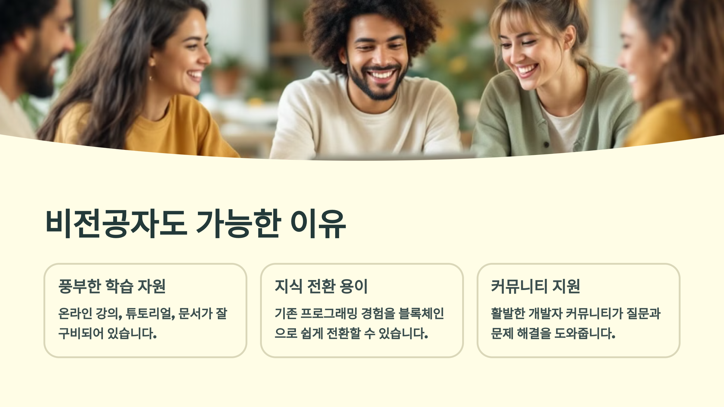 🔍 그리고 무엇보다 자기주도 학습 환경이 잘 되어 있어요. 온라인 강의, 오픈소스 코드, 공식 문서, 글로벌 커뮤니티 등 자습 가능한 자원이 풍부하기 때문에 스스로 학습하며 성장하기에 딱 좋은 환경이에요. 비전공자도 3~6개월만 제대로 집중하면 스마트 컨트랙트 하나쯤은 만들 수 있어요!
