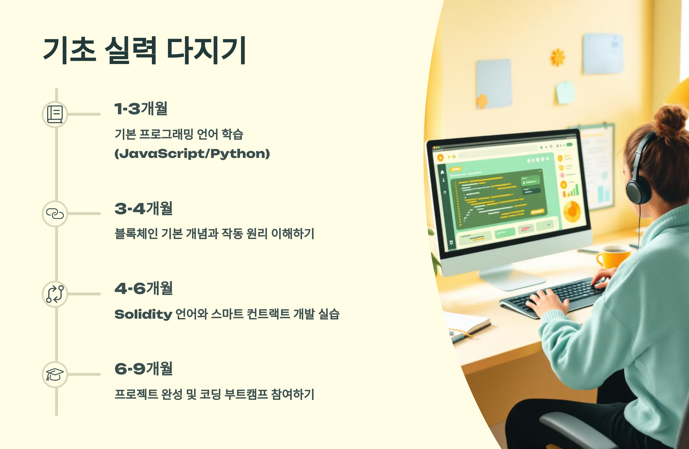 A3. 걱정 마세요! HTML, JavaScript, Solidity 등 대부분 입문자도 접근할 수 있는 언어예요. 무료 강의와 커뮤니티도 많아서 처음부터 차근차근 배우면 충분히 따라갈 수 있어요.