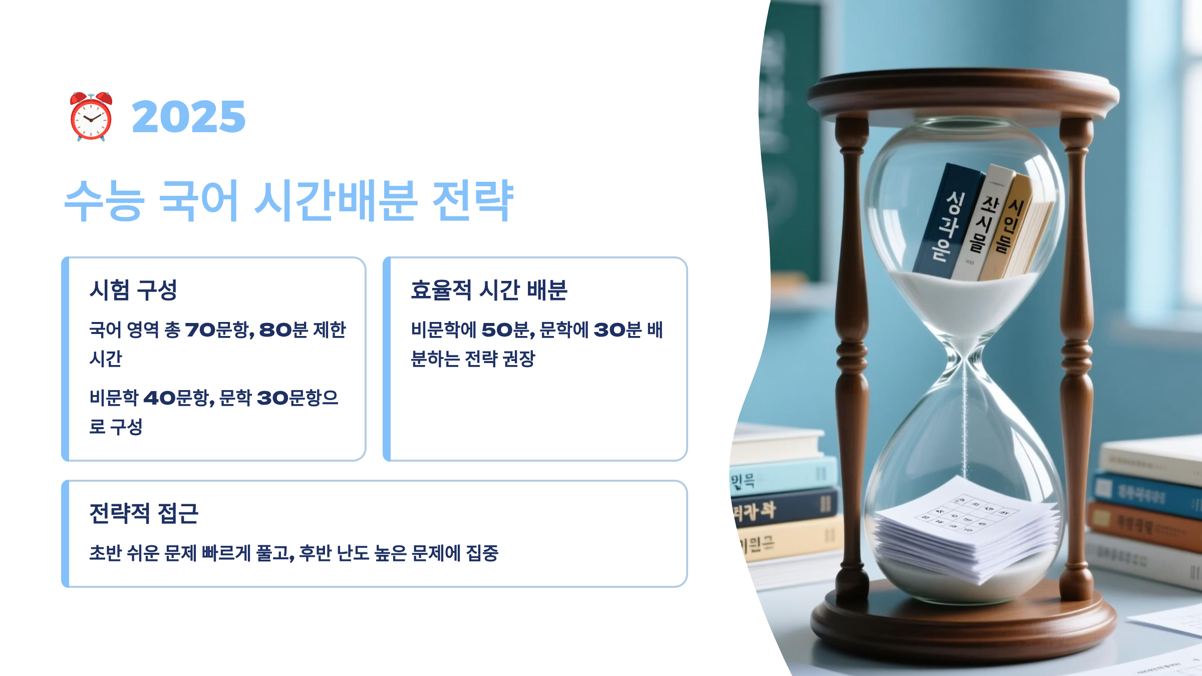 수능 국어 80분을 어떻게 배분하느냐가 점수를 좌우해요. 많은 수험생들이 시간 부족으로 마지막 문제들을 제대로 풀지 못하는 경우가 많은데, 이는 체계적인 시간 관리 전략이 없기 때문이에요. 실제로 상위권 학생들의 공통점은 철저한 시간 배분 계획을 가지고 있다는 거예요. 🕐