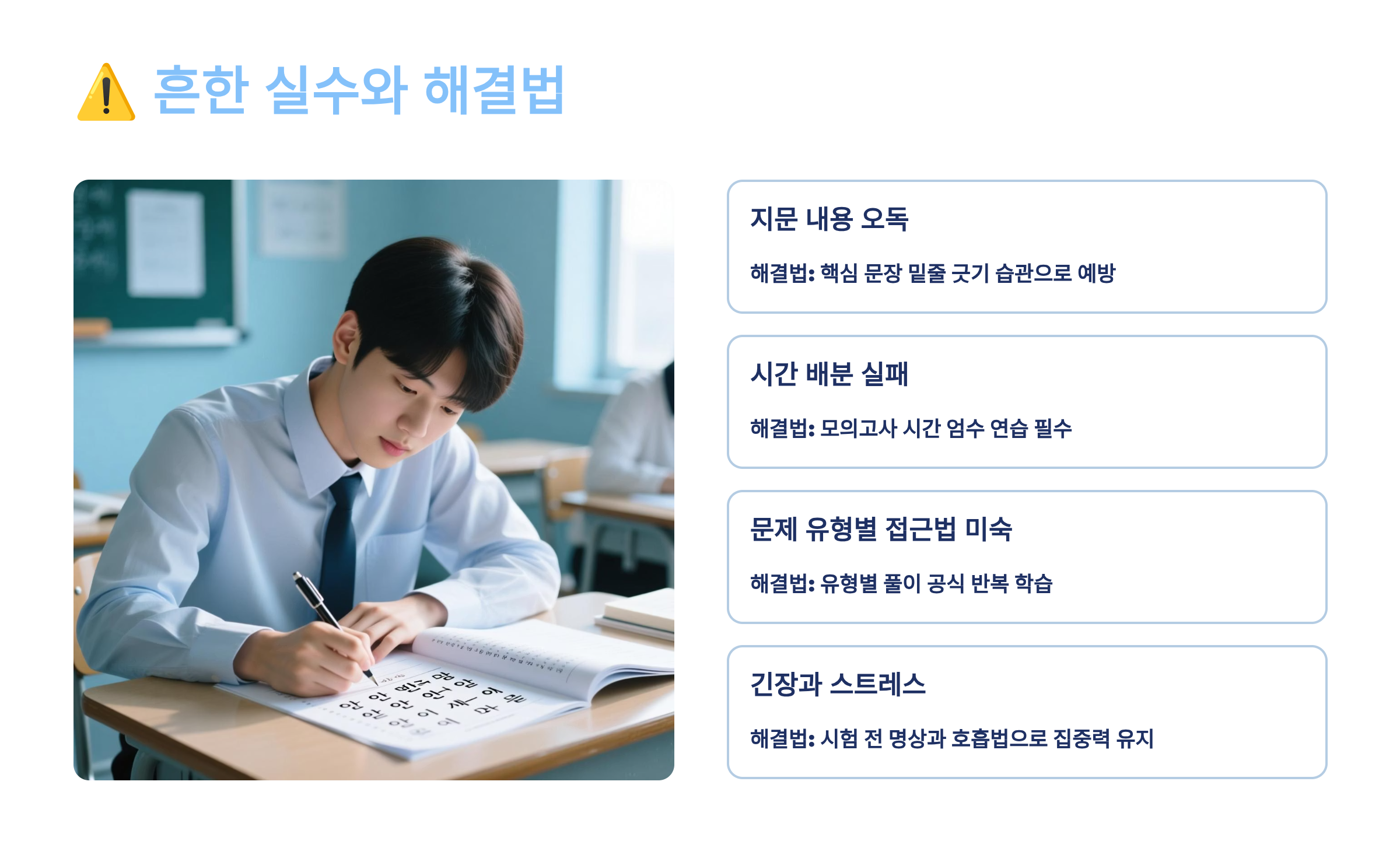 수능 국어에서 반복되는 실수들이 있어요. 이런 실수들을 미리 알고 대비한다면 시험장에서 당황하지 않고 침착하게 대처할 수 있어요. 많은 선배들이 겪었던 실수와 그 해결법을 정리해드릴게요. 미리 알면 피할 수 있는 함정들이랍니다! ⚠️