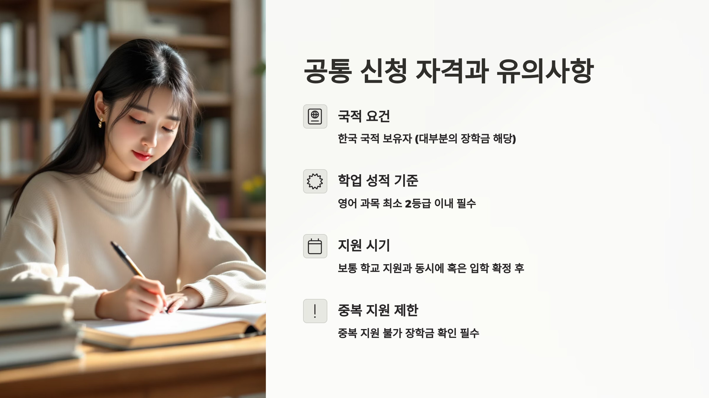 다음은 🧾 공통 신청 자격과 유의사항 학력, 경력, 영어점수 등 모든 장학금에 공통되는 기본 요건을 정리해줄게요!