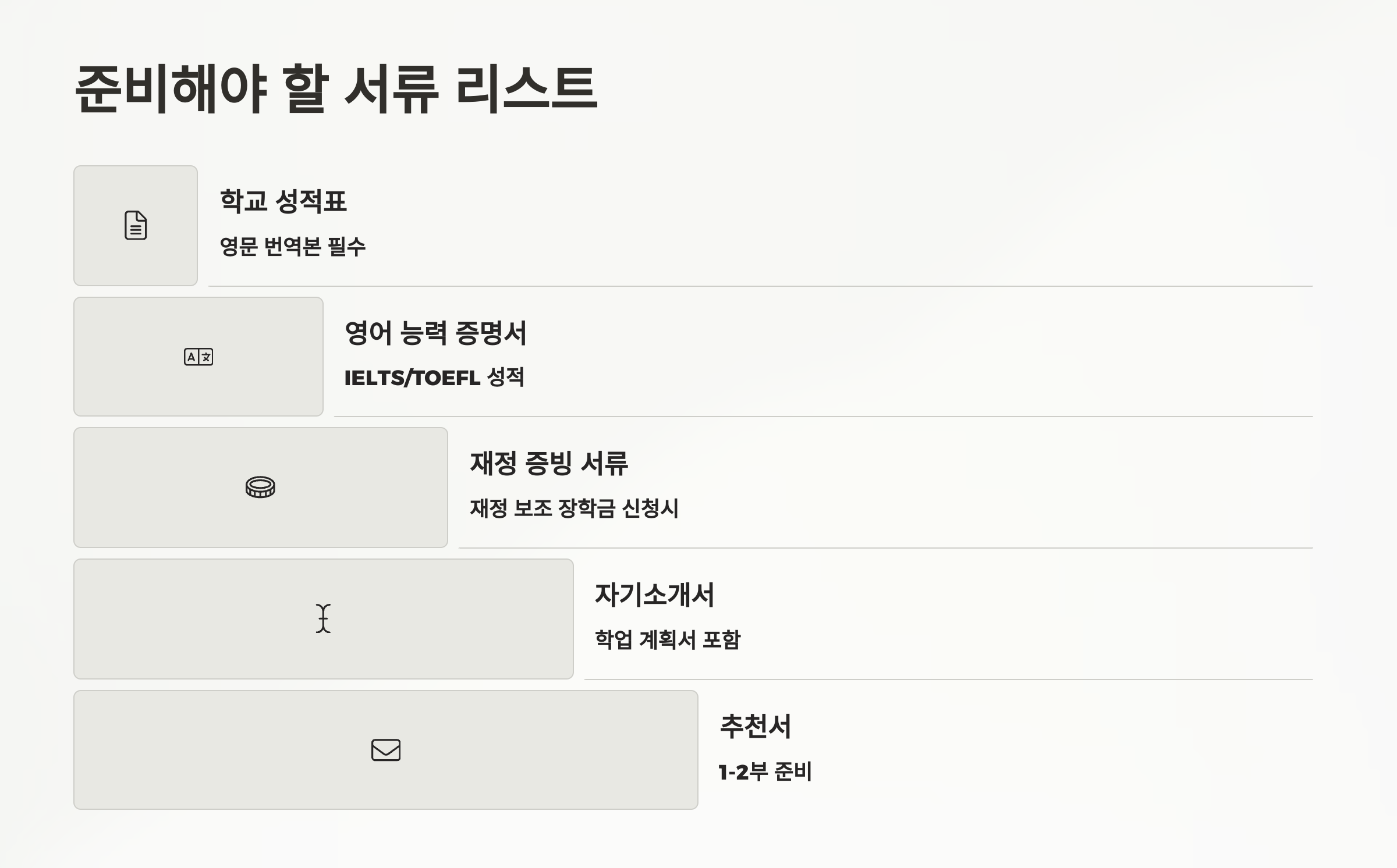 ✔ 신청 전 입학허가서 확보, 추천인 확보, 에세이 수정은 필수 준비 항목이에요!