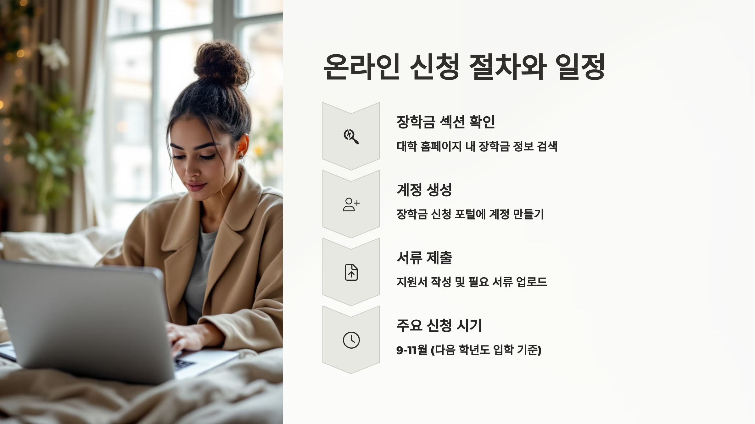 이제 다음은 🖥️ 온라인 신청 절차와 일정 각 장학금의 접수 포털, 마감일, 진행 순서를 한눈에 정리해줄게요! ⏰💻