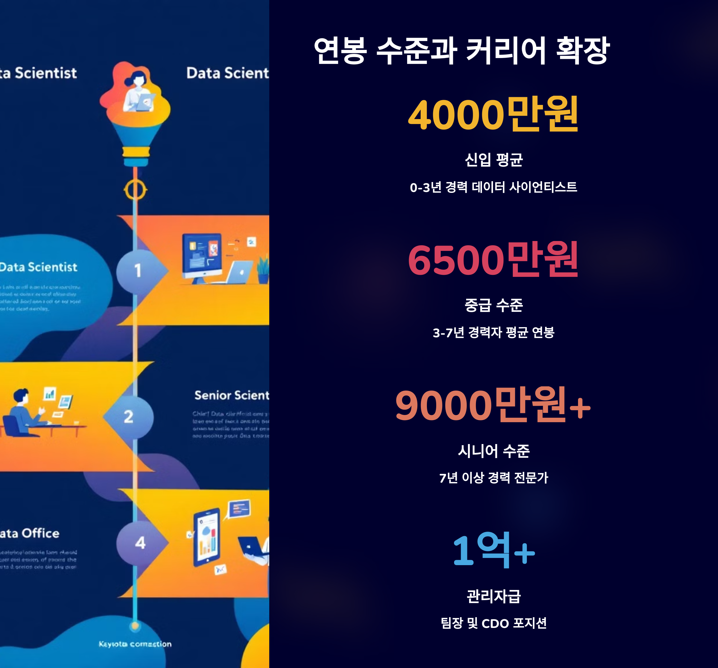 데이터 사이언티스트는 AI·데이터 기반 산업의 핵심 인재로 인정받으며 연봉 수준도 상당히 높은 편이에요. 특히 경력에 따라 급격한 연봉 상승이 가능해요.