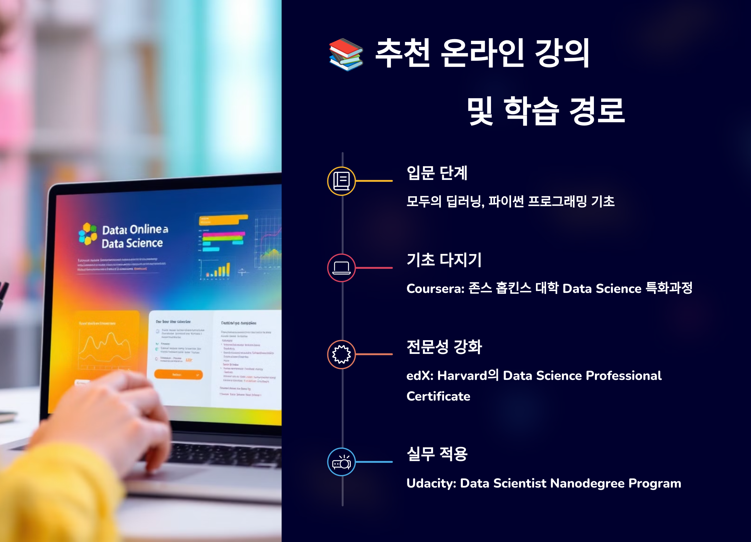 데이터 사이언티스트가 되기 위한 공부는 혼자서 독학 가능하지만, 체계적인 커리큘럼이 있으면 훨씬 효율적이에요. 국내외에서 신뢰받는 강의 플랫폼과 실무에 가까운 과정 위주로 추천드릴게요.