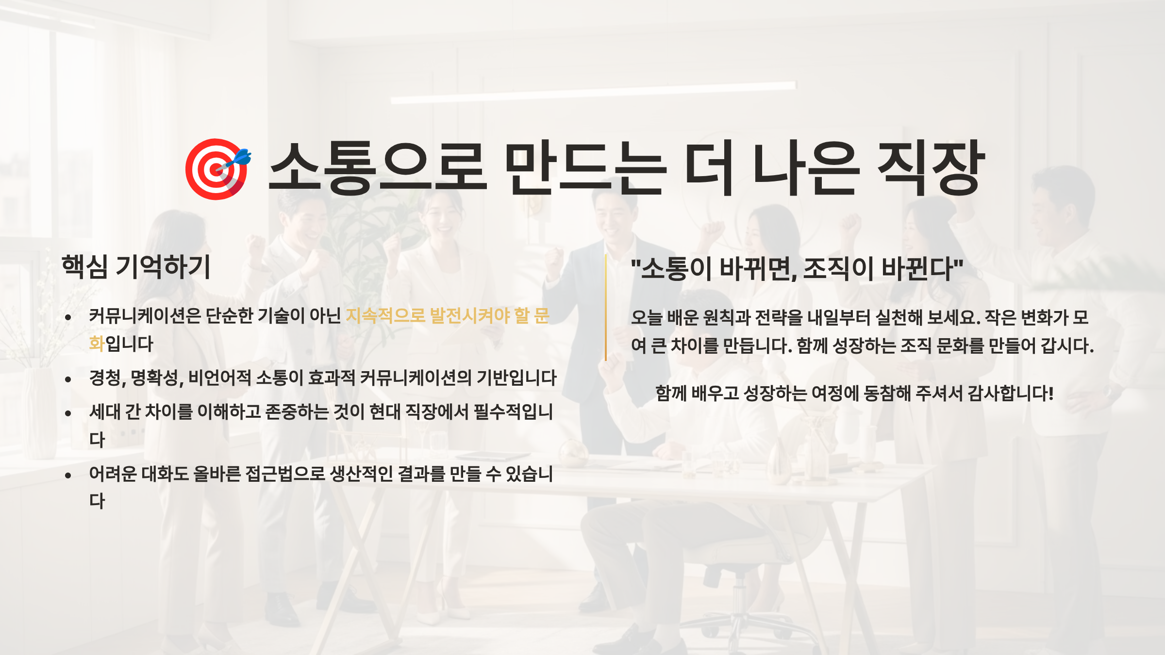 직장에서의 성공은 혼자 이루는 것이 아니라 함께 만들어가는 것이에요. 오늘 배운 커뮤니케이션 스킬로 더 나은 팀워크를 만들고, 긍정적인 조직 문화를 만들어가는 주인공이 되세요! 여러분의 성장과 성공을 응원합니다! 🚀