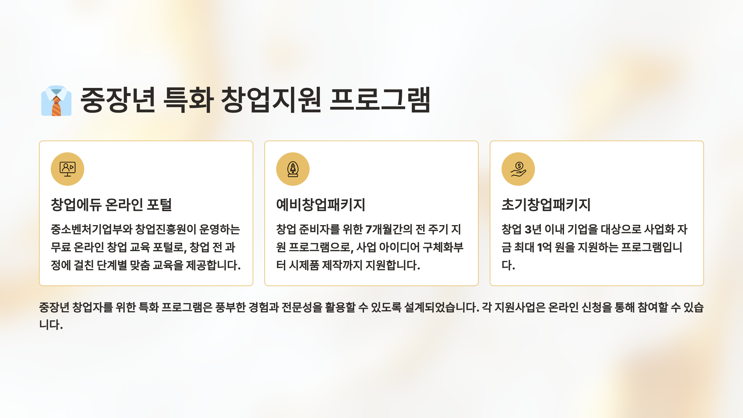 퇴직 후 새로운 도전을 준비하시나요? 🚀 중장년층의 창업은 단순한 도전이 아닌, 축적된 경험과 전문성을 바탕으로 한 제2의 인생 설계입니다! 정부와 지자체에서는 퇴직 예정자와 중장년층을 위한 다양한 창업교육 프로그램을 운영하고 있어요. 특히 2025년부터는 지원 규모가 대폭 확대되어 더 많은 기회가 열렸답니다.