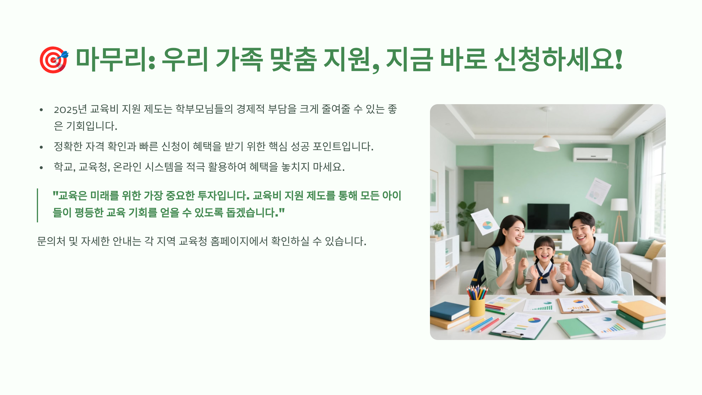 본 글의 교육비 지원 관련 정보는 2025년 1월 기준으로 작성되었으며, 정책 변경에 따라 세부 내용이 달라질 수 있습니다. 정확한 정보는 교육부, 시도교육청, 복지로 공식 사이트에서 확인하시기 바랍니다. 개인별 상황에 따라 지원 자격과 금액이 다를 수 있으므로 반드시 관할 기관에 문의 후 신청하시기 바랍니다.