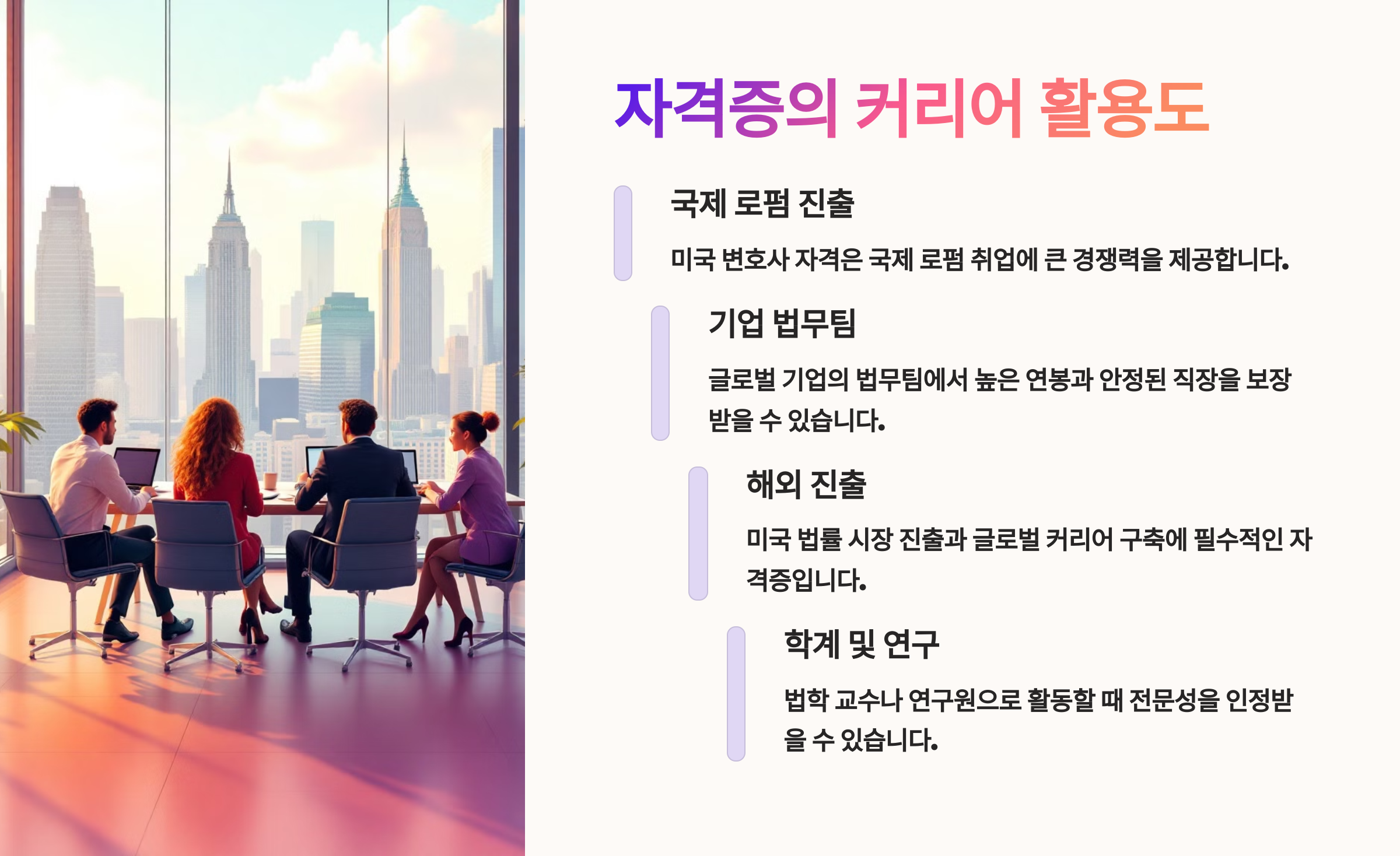 이제 다음 섹션에서는 🧭 미국 변호사 자격증의 커리어 활용도 진짜 이 자격증이 어디서, 어떻게 쓰이는지 사례 중심으로 알려드릴게요!