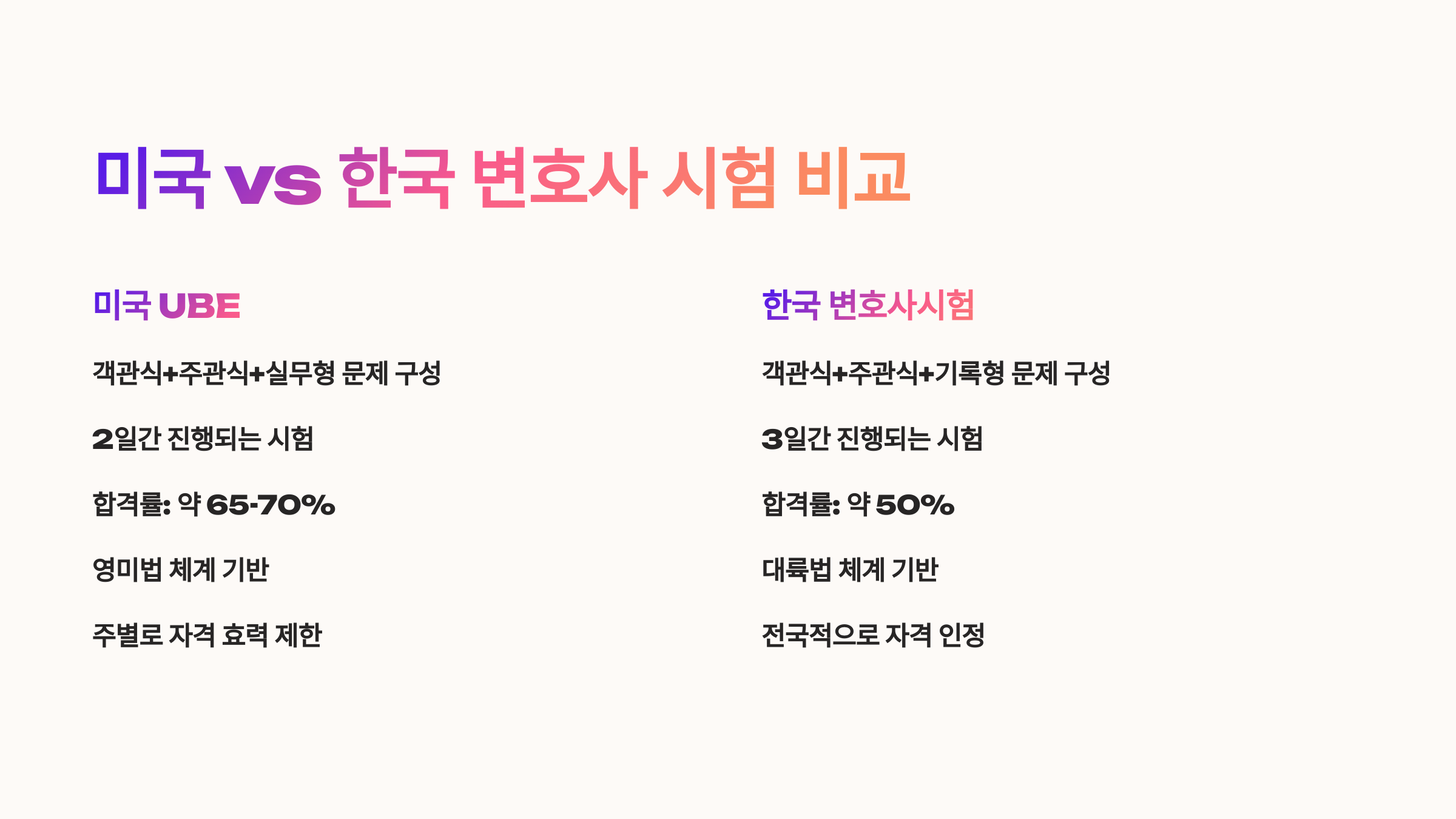 | 항목 | 미국 (UBE) | 한국 (변호사시험) |