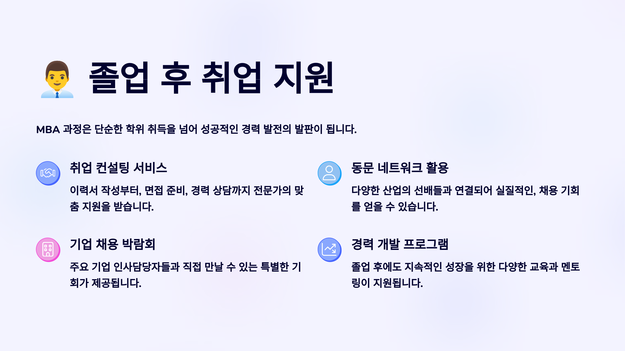 MBA 과정은 가격이 비쌀수록 더 많은 글로벌 네트워크와 실무 중심의 교육을 제공하는 경향이 있어요. 하지만 비용이 부담스럽다면, 국내 MBA 온라인 과정도 충분히 경쟁력 있는 선택이 될 수 있어요. 그럼 이제 👨💼 졸업 후 취업 지원 섹션으로 넘어가 볼게요!