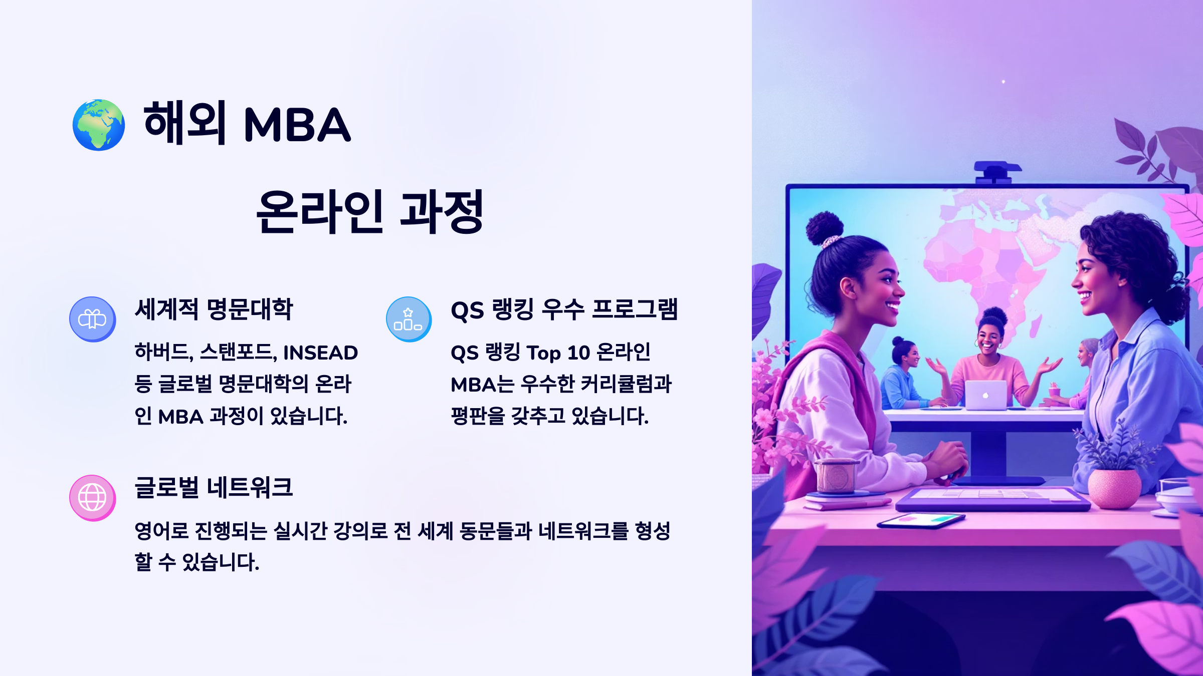 | 하버드 비즈니스 스쿨 | 온라인 MBA | 약 2만 5천 달러 (약 3,200만 원) | 사례 연구 방식, 글로벌 네트워크 |