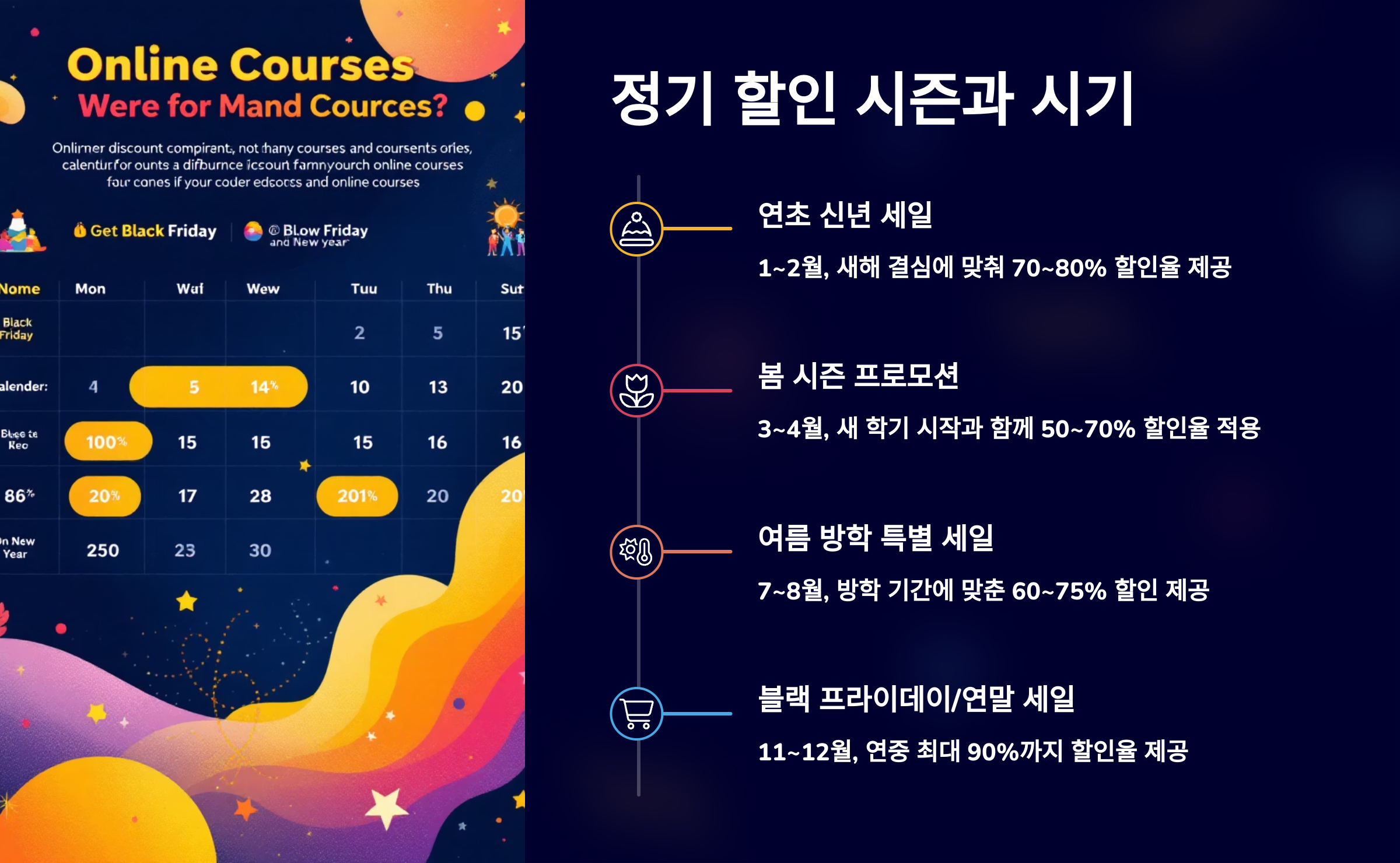| 1월 1~15일 | 신년 세일 | 최대 90% | 연초 자기계발 수요 증가 시기 |
