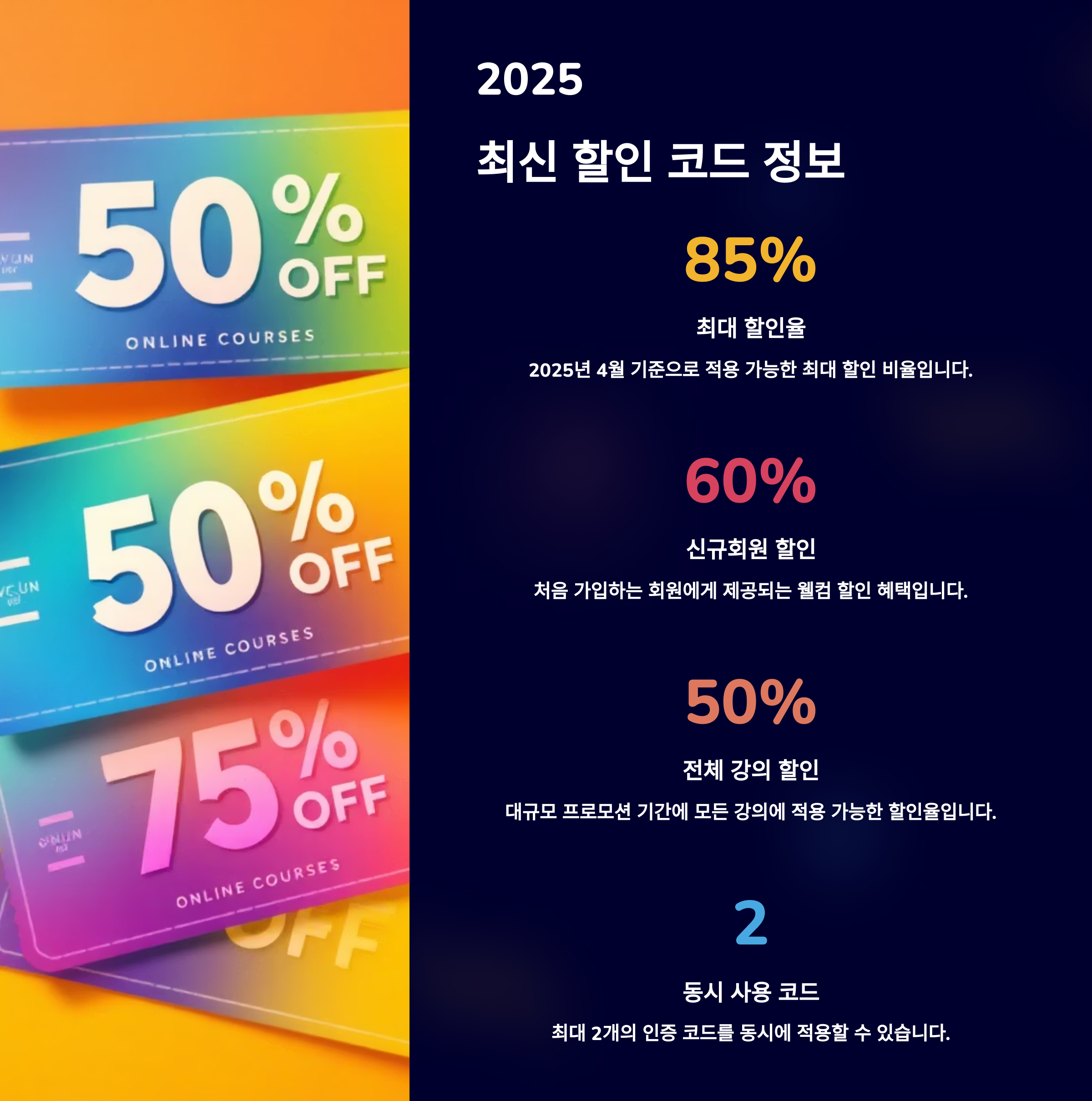 오늘 바로 원하는 강의를 찜해두고, 할인 코드로 제대로 절약해서 시작해봐요! 당신의 배움을 응원할게요. 🚀✨