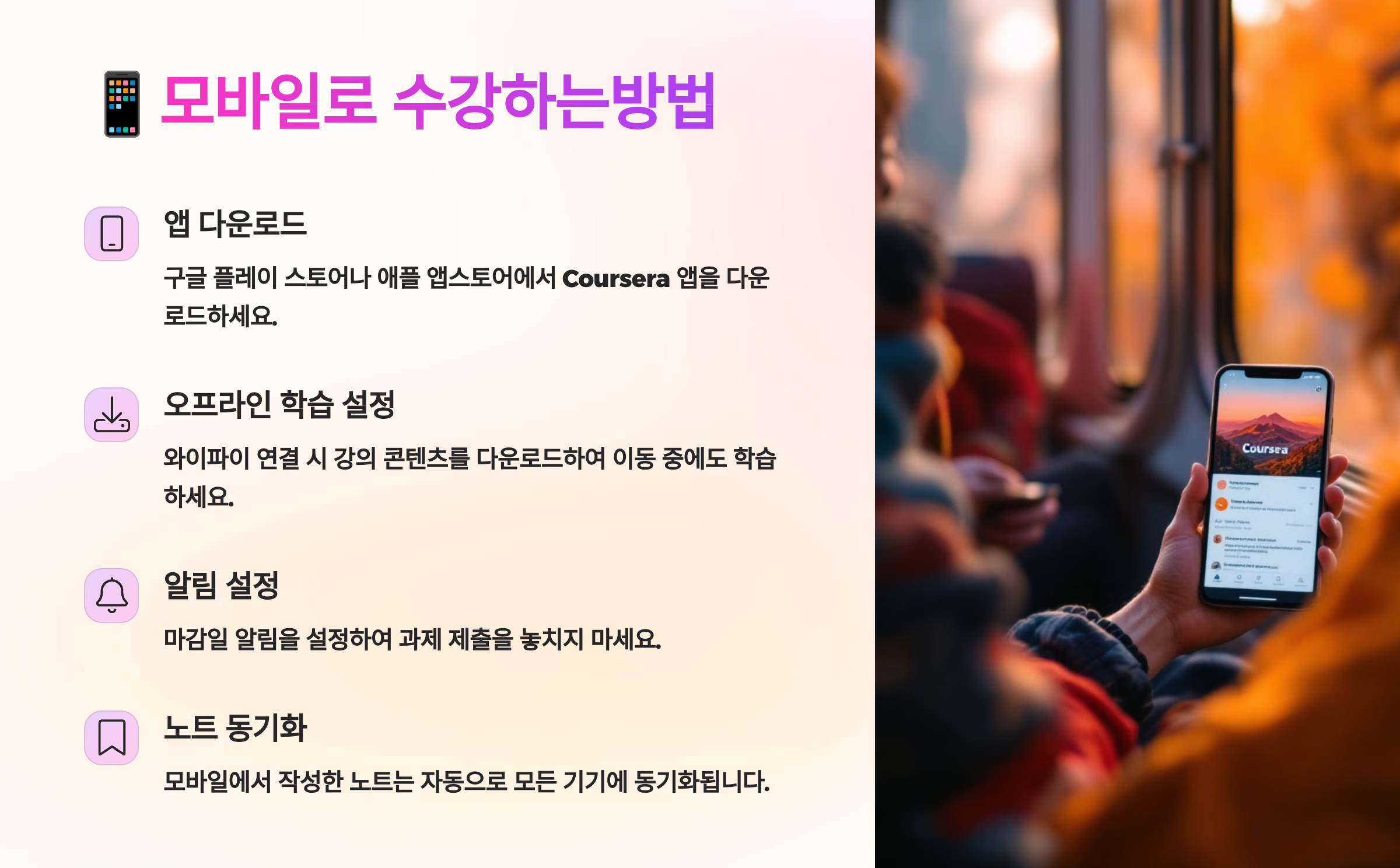 📲 Coursera는 iOS와 안드로이드 모두에서 앱을 제공하고 있어요. PC가 없어도 강의 수강, 퀴즈 응시, 과제 제출까지 모바일로 전부 처리 가능해서 정말 편리해요. 실제로 많은 수강생들이 출퇴근 시간, 카페, 도서관, 공원 등 자투리 시간에 모바일로 학습을 이어가고 있어요. 강의 콘텐츠의 100%가 모바일 앱에서도 동일하게 제공되니 모든 환경에서 끊김 없는 학습 경험을 누릴 수 있어요.