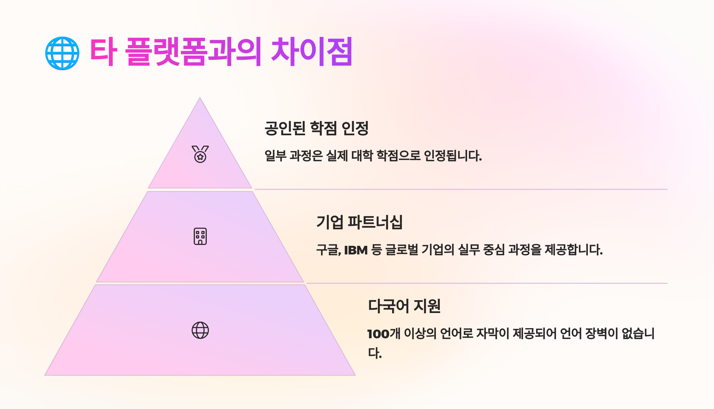 🔍 Udemy, edX, FutureLearn, LinkedIn Learning 등 다양한 온라인 플랫폼이 존재하지만, Coursera만의 뚜렷한 차별점이 있어요. 단순히 강의 콘텐츠만 제공하는 것이 아니라, ‘교육기관 인증 + 커리어 연결성 + 학위 가능성’이라는 3박자를 갖춘 유일한 플랫폼이라는 점에서 장기적인 경력 개발에 탁월한 선택이에요.