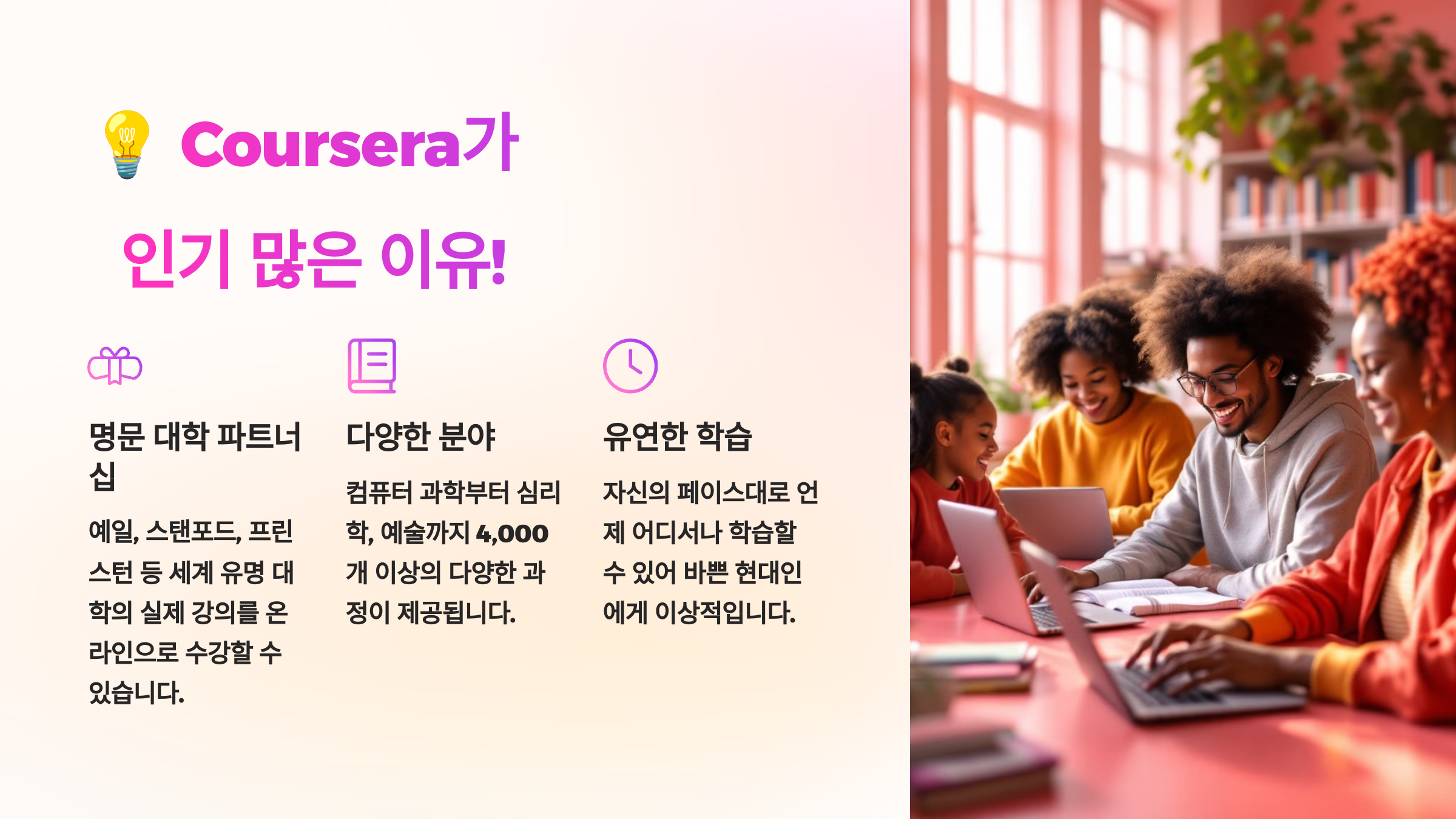 🎓 Coursera는 전 세계 수백 개 대학과 기업이 함께 만든 글로벌 온라인 강의 플랫폼이에요. MIT, 스탠퍼드, 구글, IBM 등 유명 기관들의 공식 인증 강의를 누구나 집에서 들을 수 있다는 점에서 완전 매력적이죠!