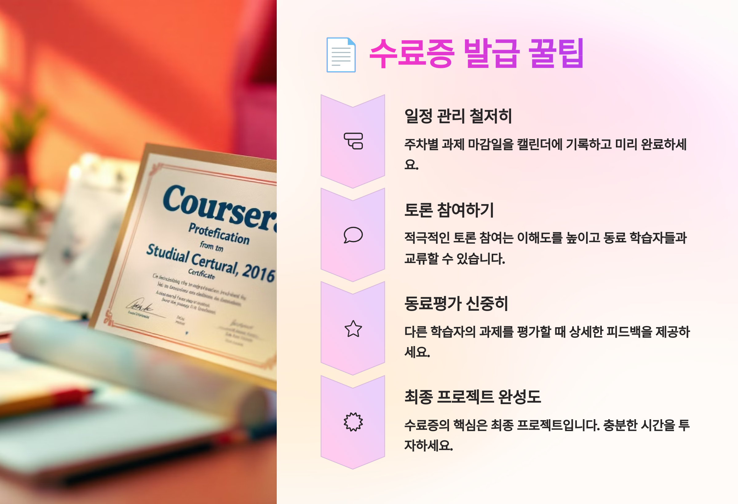 📜 Coursera에서 수료증을 받으려면 단순히 강의만 듣는 것으로는 부족해요. 반드시 모든 과제, 퀴즈, 중간 및 최종 시험을 정해진 기준에 맞춰 모두 완료해야만 수료증 발급이 가능해요. 과제 난이도나 요구사항이 만만하지 않기 때문에, 실제로 실력 점검과 학습 성취도 평가가 정교하게 이뤄지는 시스템이라고 할 수 있어요. 단순한 청강이 아니라, 진짜 학습을 했다는 증거로서의 수료증이죠.