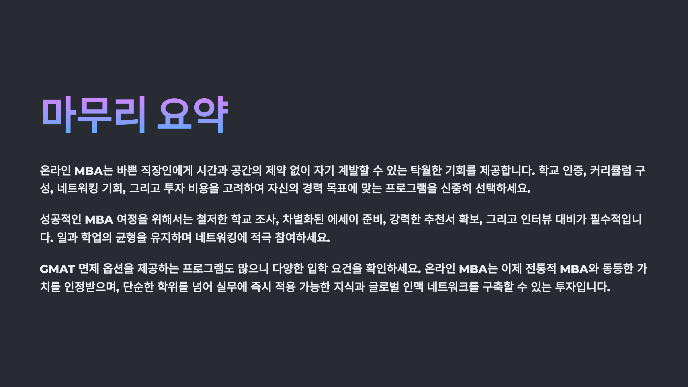 📚 지금까지 MBA 온라인 과정에 대해 총정리해봤어요. MBA는 단순한 학위가 아니라, 리더로 성장하기 위한 경험과 전략적 커리어 전환을 위한 도구예요. 특히 온라인 MBA는 시간과 공간의 제약 없이 이 모든 것을 가능하게 해주죠.