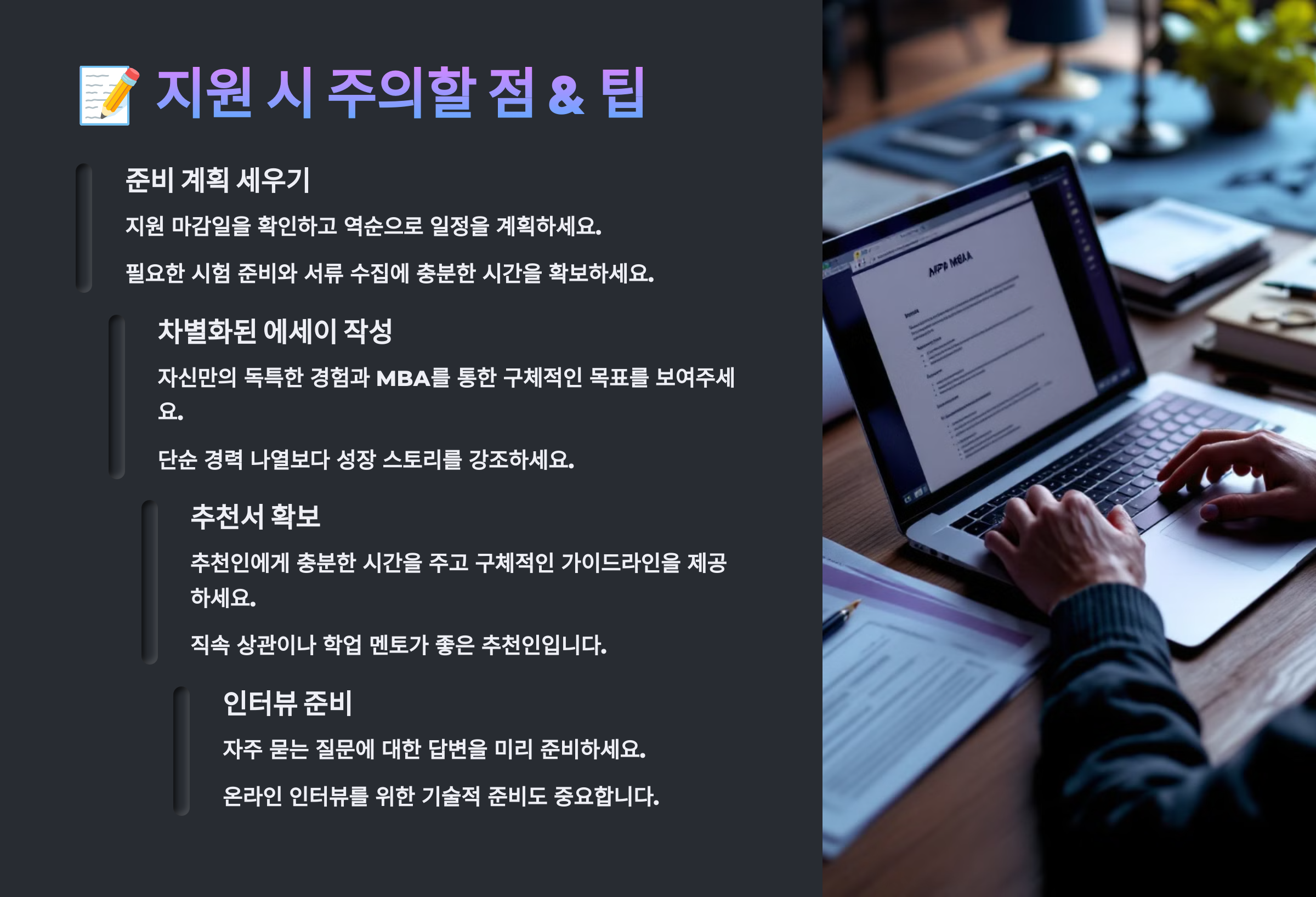 🧾 다음 섹션에서는 온라인 MBA 지원 시 유의해야 할 점들과 합격 확률을 높이는 꿀팁들을 알려드릴게요! ✍️