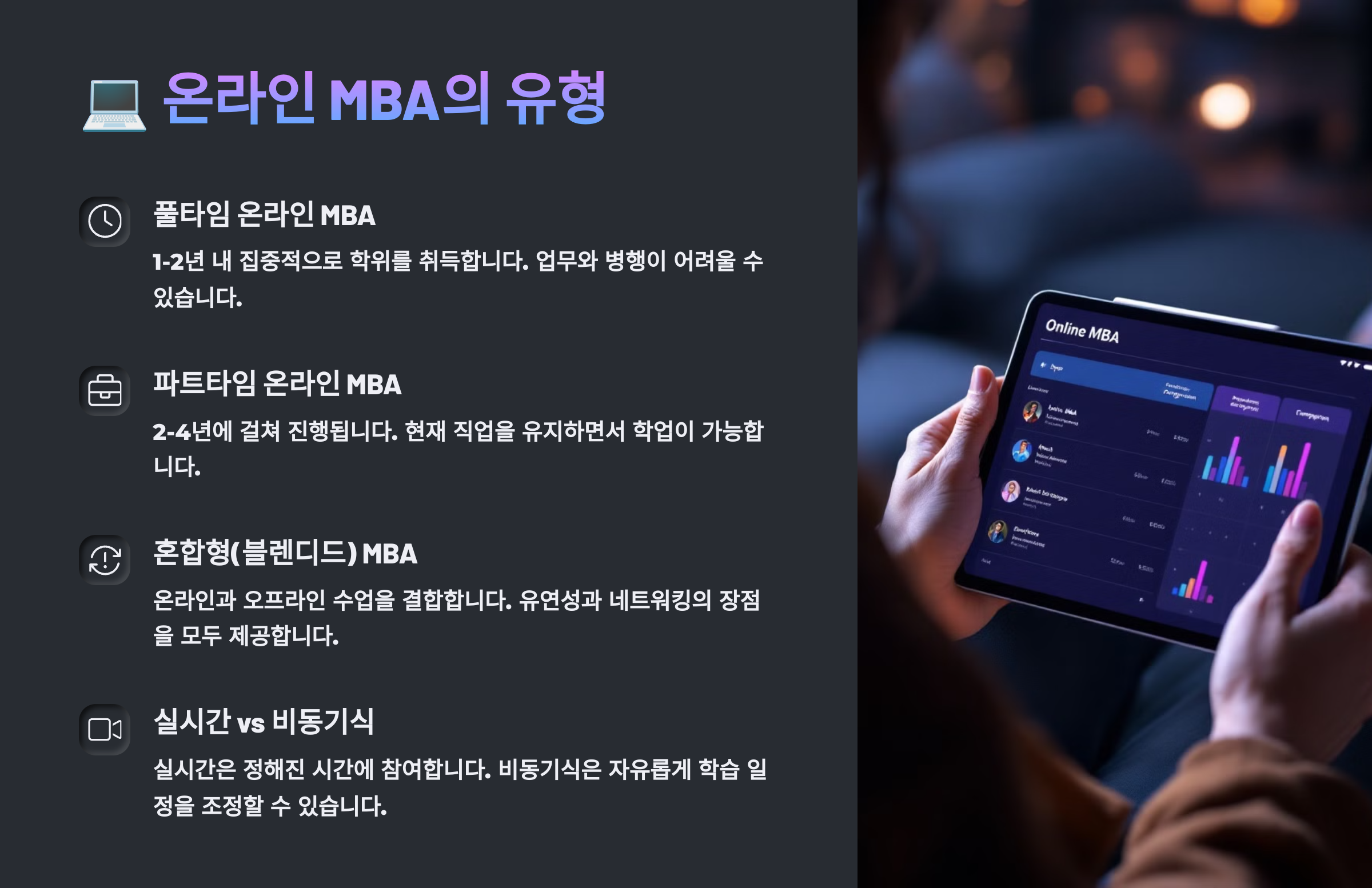 🌐 온라인 MBA는 형태, 시간, 참여 방식에 따라 다양한 유형으로 나뉘어요. 요즘은 기술 발전 덕분에 온라인 MBA도 오프라인 못지않은 퀄리티를 제공하고 있어요!