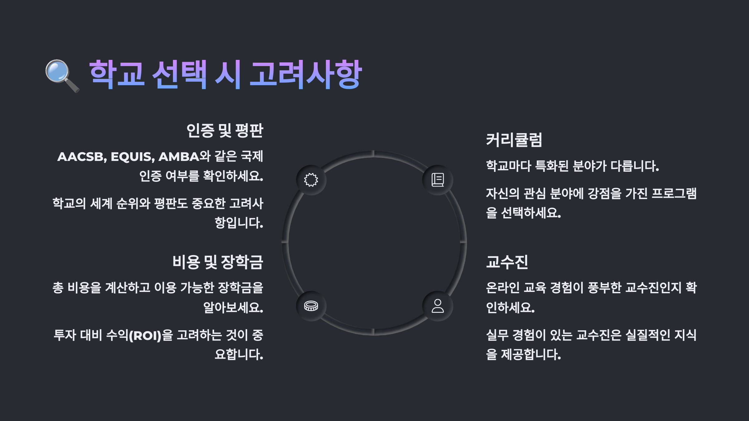 💰 세 번째는 비용과 장학금이에요. MBA는 평균적으로 수천만 원이 들 수 있기 때문에 장학금 제도나 분납 옵션 등을 잘 따져보는 게 중요해요. 학교에 따라 학비 차이가 꽤 크답니다.