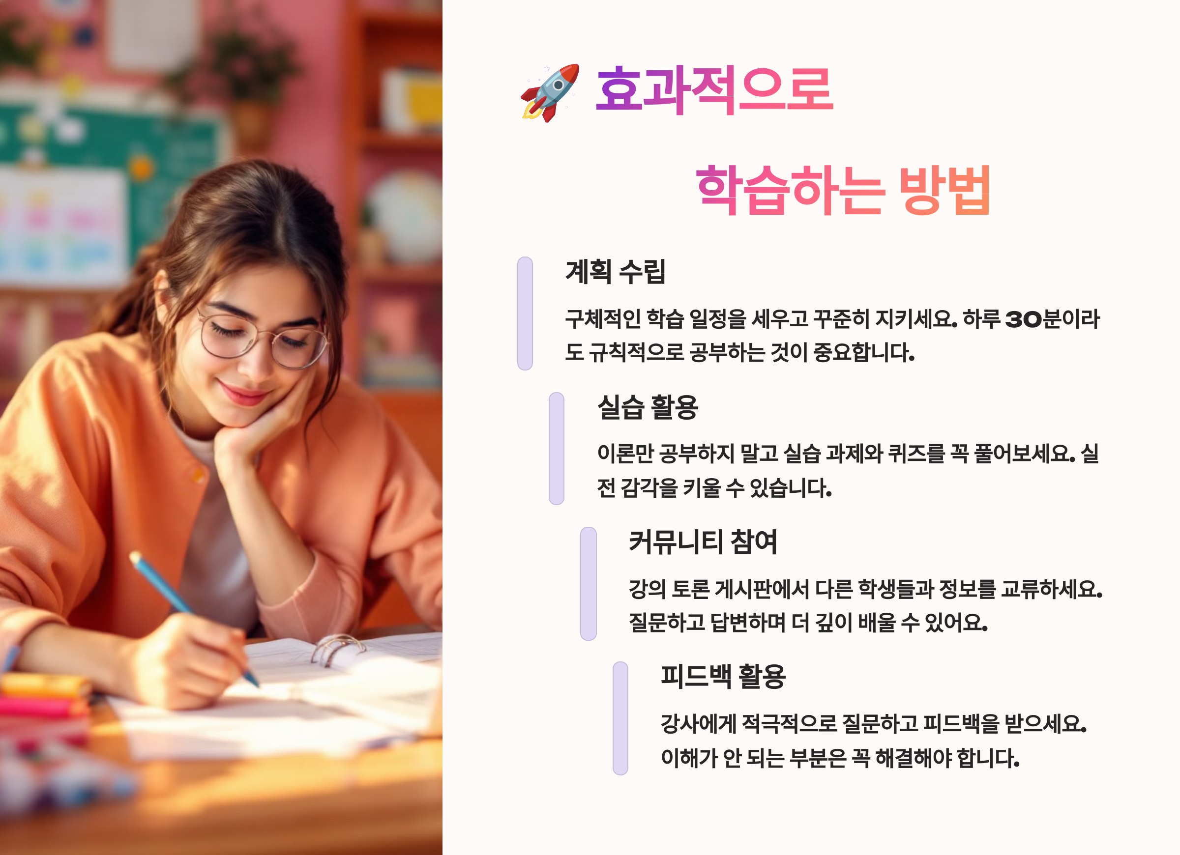🧠 아무리 좋은 강의라도 그냥 틀어놓고 보기만 하면 실력 향상에는 한계가 있어요. 능동적으로 수강하는 자세가 무엇보다 중요해요. 강의 시청 중 핵심 개념 메모, 키워드 정리, 중간중간 퀴즈로 복습하는 루틴을 만드는 게 학습 정착에 큰 도움이 돼요. 단순히 끝까지 듣는 것보다, 직접 정리하고 요약하는 과정이 기억력과 이해도를 동시에 끌어올려줘요.