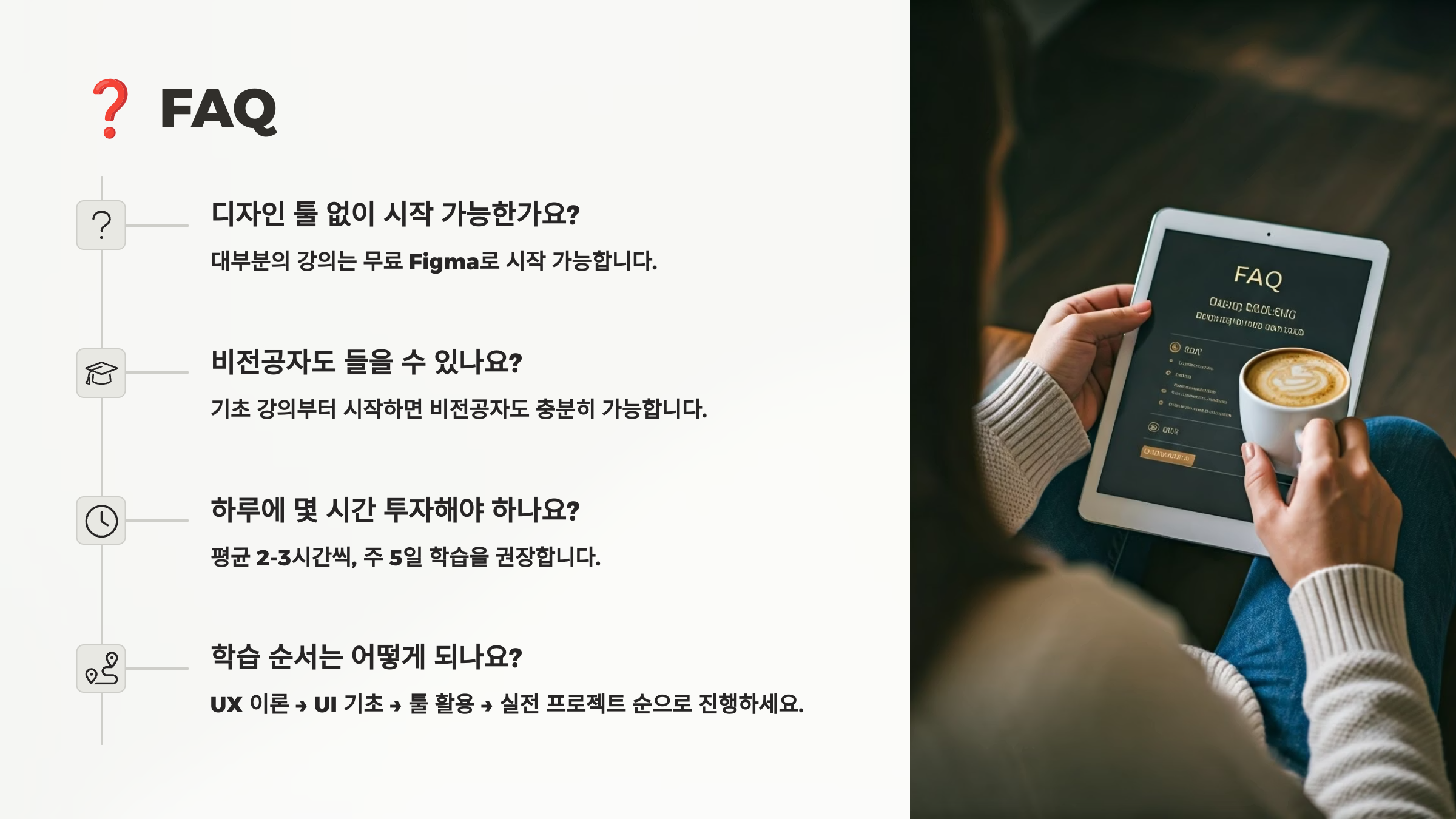 이제 다음은 ❓ FAQ UX/UI 디자인 강의 관련해서 가장 자주 묻는 질문 8가지를 소개할게요!