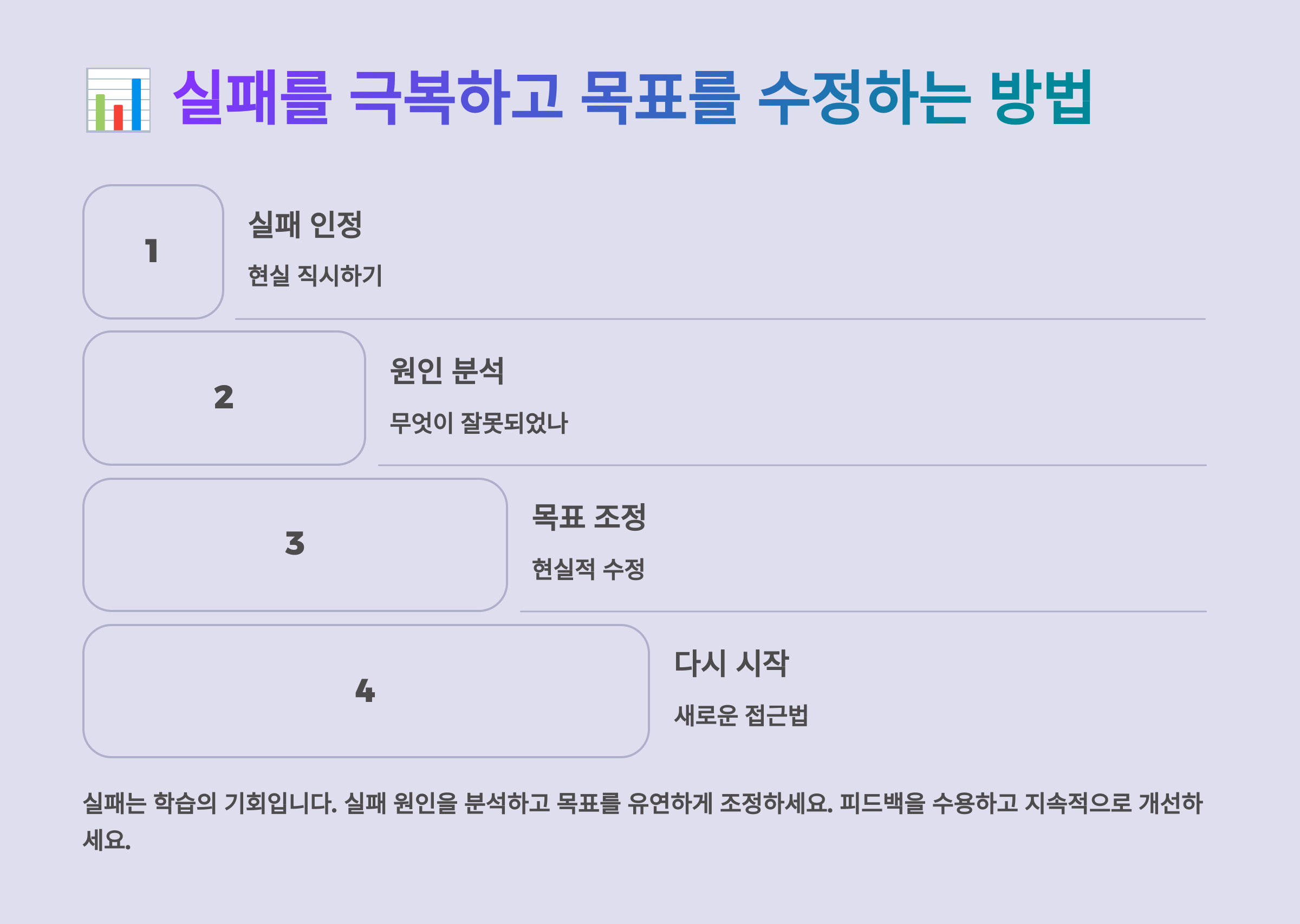 목표를 달성하는 과정에서 실패를 경험하는 것은 자연스러운 일이에요. 중요한 것은 실패를 어떻게 극복하고 목표를 수정해 나가느냐예요. 💪