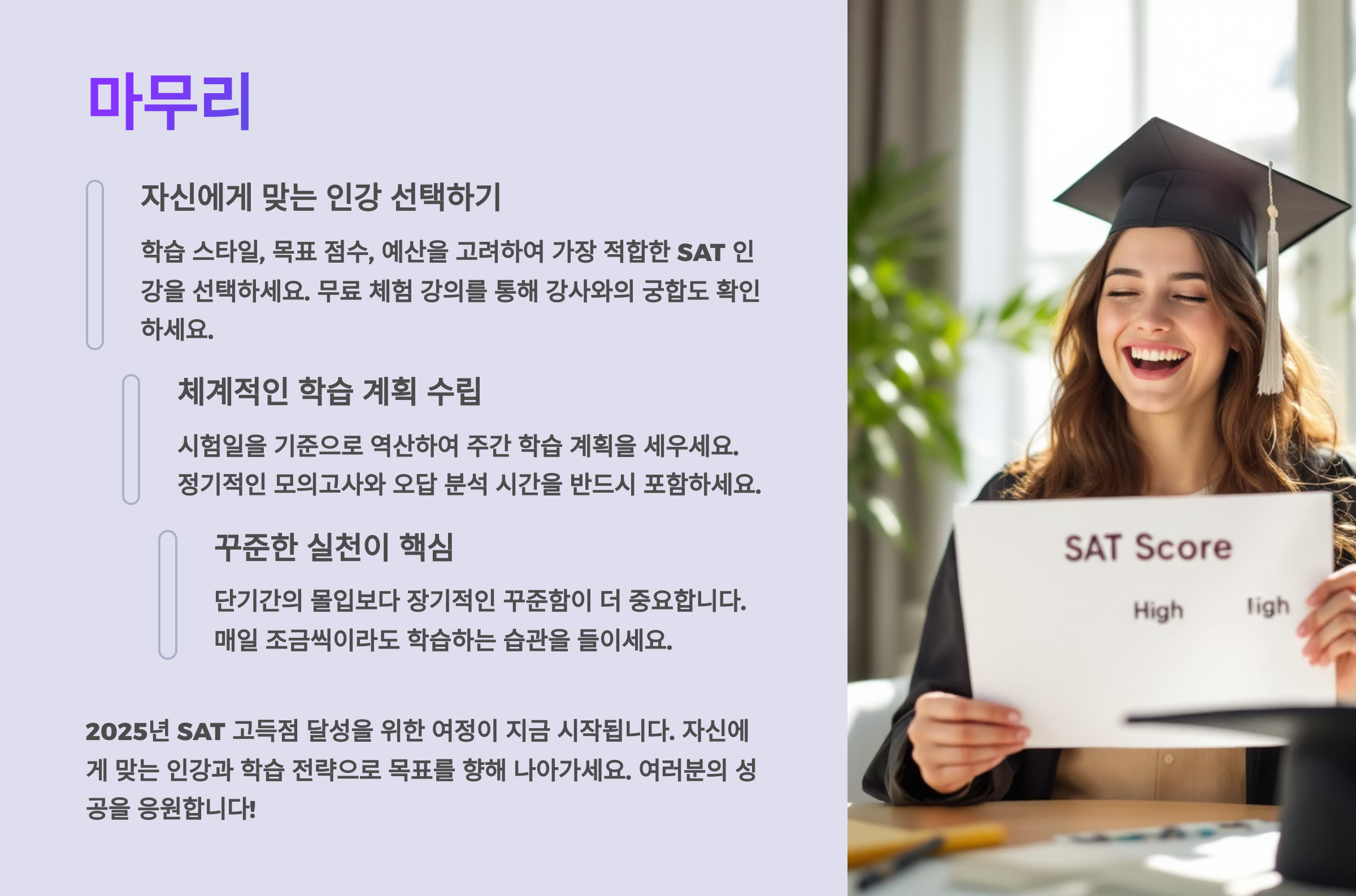 2025년 SAT 준비는 이제 디지털 전환까지 고려해야 하는 시대가 되었어요. 그래서 강의 선택이 더욱 중요해졌고, 제대로 준비하면 누구나 고득점에 도달할 수 있어요! 🌟