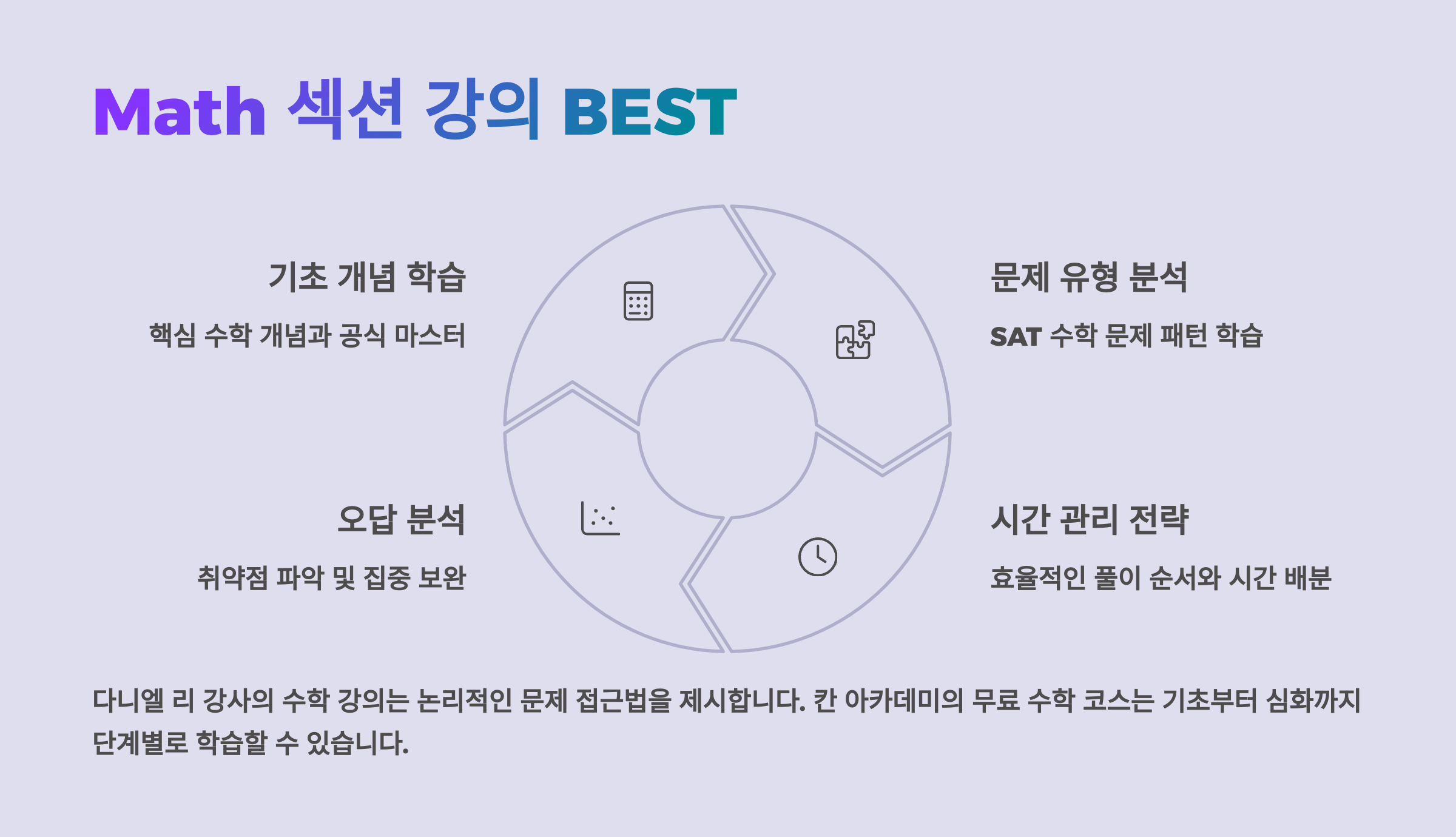 SAT Math는 점수 올리기 가장 빠른 과목이기도 하지만, 디지털 SAT에서는 난이도 조정이 더욱 섬세해졌어요! 정확도와 속도를 동시에 잡을 수 있는 강의가 필요해요. 🧮