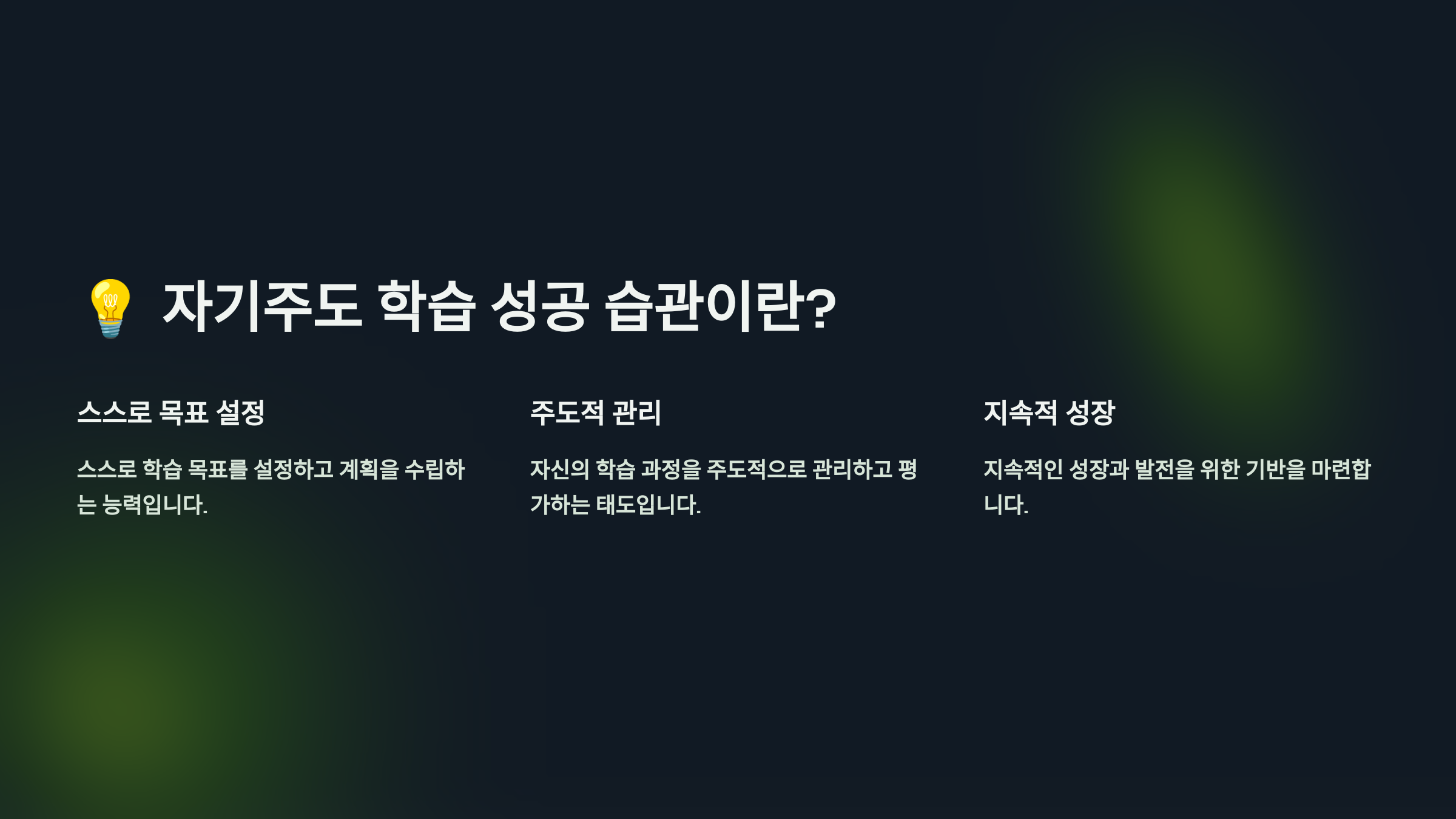 💡 자기주도 학습 성공 습관이란 스스로 목표를 설정하고, 계획을 세워 꾸준히 공부하는 태도를 의미해요. 단순히 공부하는 시간을 늘리는 것이 아니라, 효율적인 방법으로 지속하는 것이 핵심이에요.