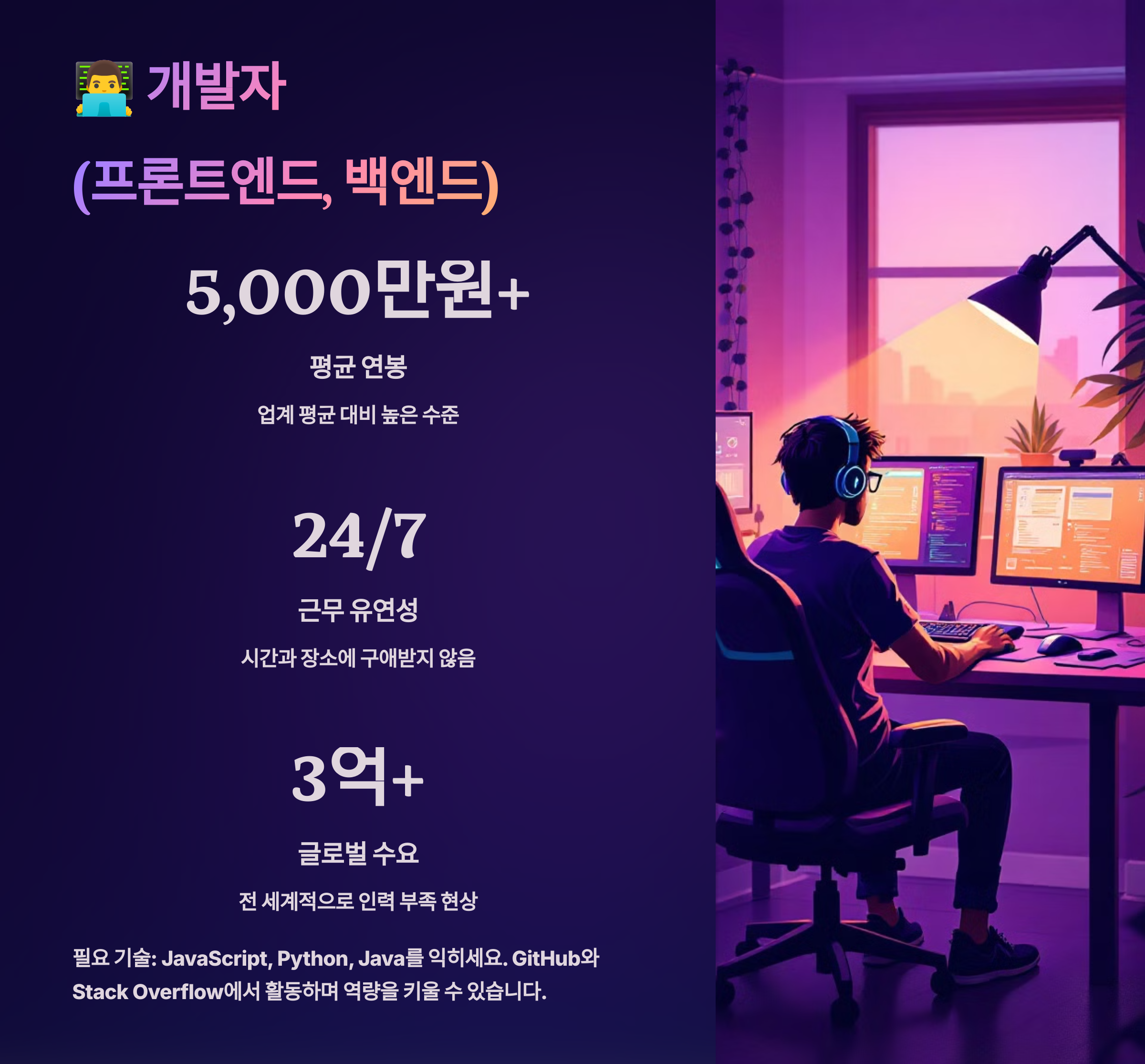 💬 내가 생각했을 때, 개발자는 가장 빠르게 원격근무에 진입할 수 있는 실전형 기술직이에요. 혼자 공부해도 포트폴리오만 있으면 충분히 도전할 수 있어요 💪
