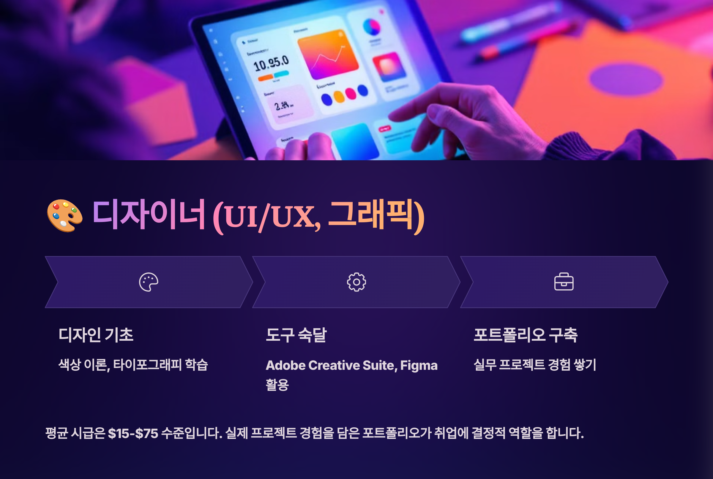 🎨 디자이너는 파일과 툴만 있으면 일할 수 있는 전형적인 원격 가능 직업이에요. 특히 UI/UX 디자이너는 IT 기업의 핵심 포지션으로 자리 잡았고, 그래픽·브랜딩·영상 디자이너도 프리랜서로 활동하는 비율이 점점 높아지고 있어요.