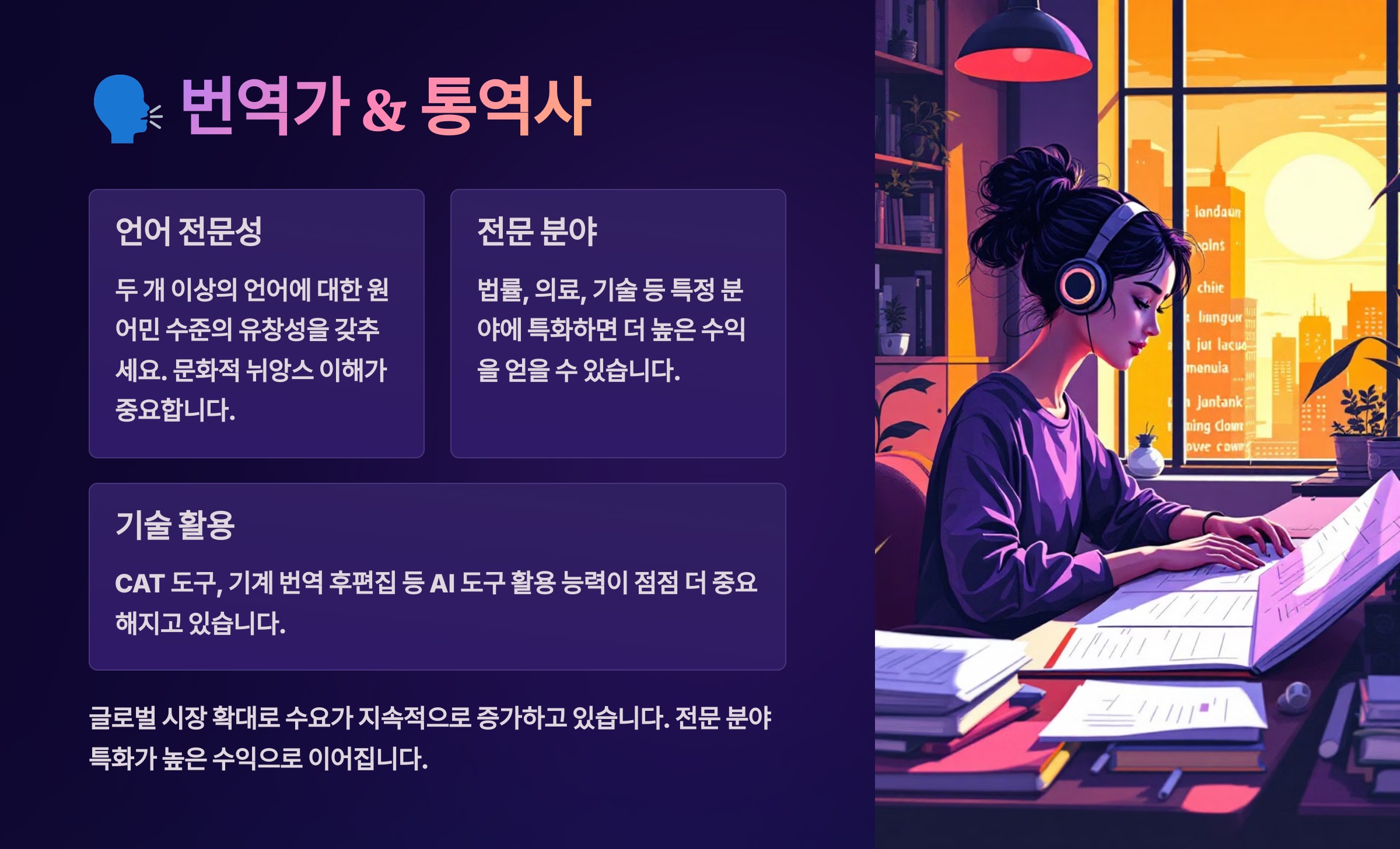 🗣 번역가 & 통역사는 언어 실력 하나로 수익을 창출하는 대표적인 원격 직업이에요. 특히 번역은 대부분 이메일·클라우드로 진행되기 때문에 시간·장소 제약 없이 재택 근무가 가능해요 🏡
