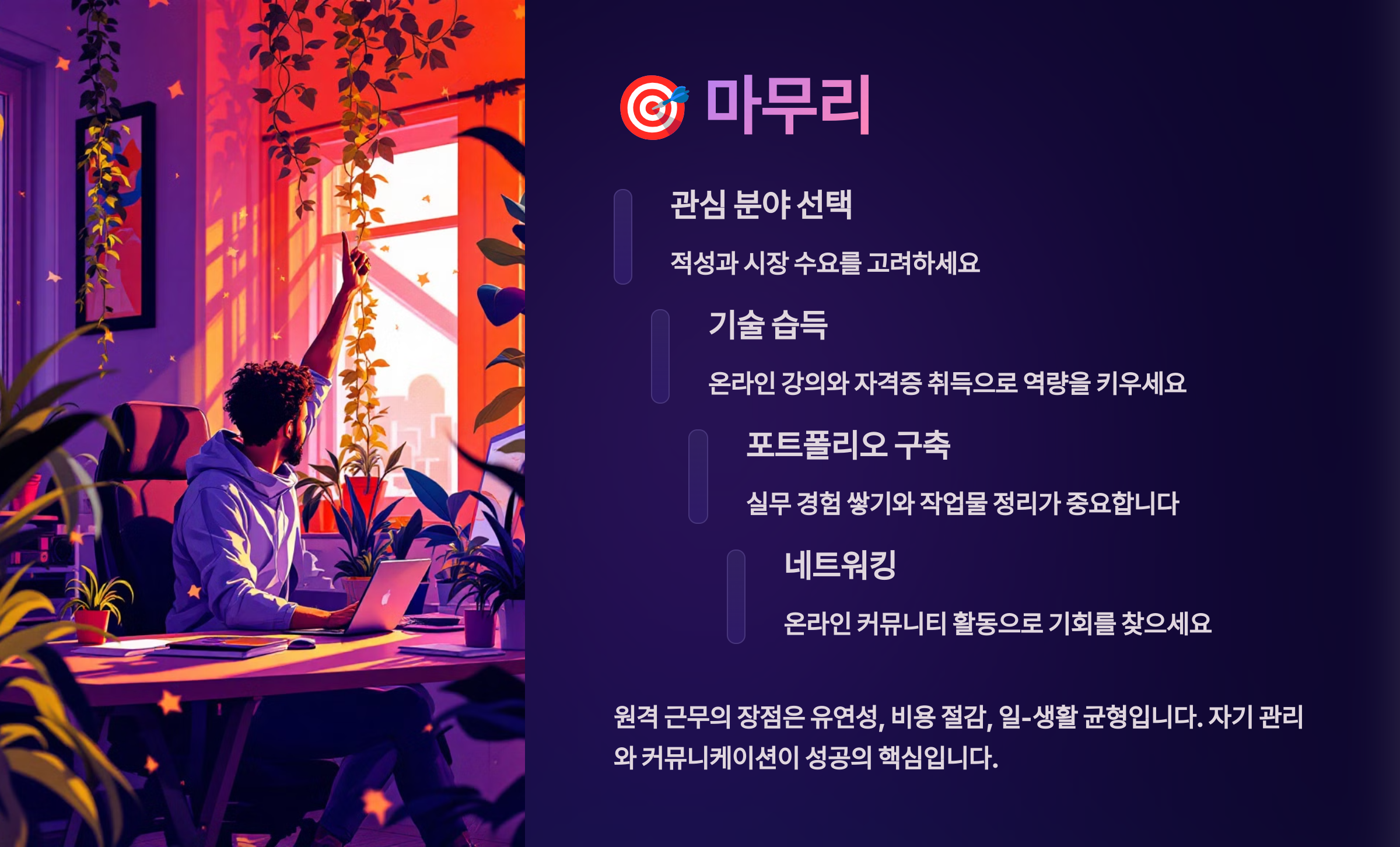 🎯 지금까지 소개한 원격 근무 직업들은 기술, 콘텐츠, 언어, 교육 등 다양한 영역에서 누구나 진입 가능하고, 수익도 낼 수 있는 직군들이에요.
