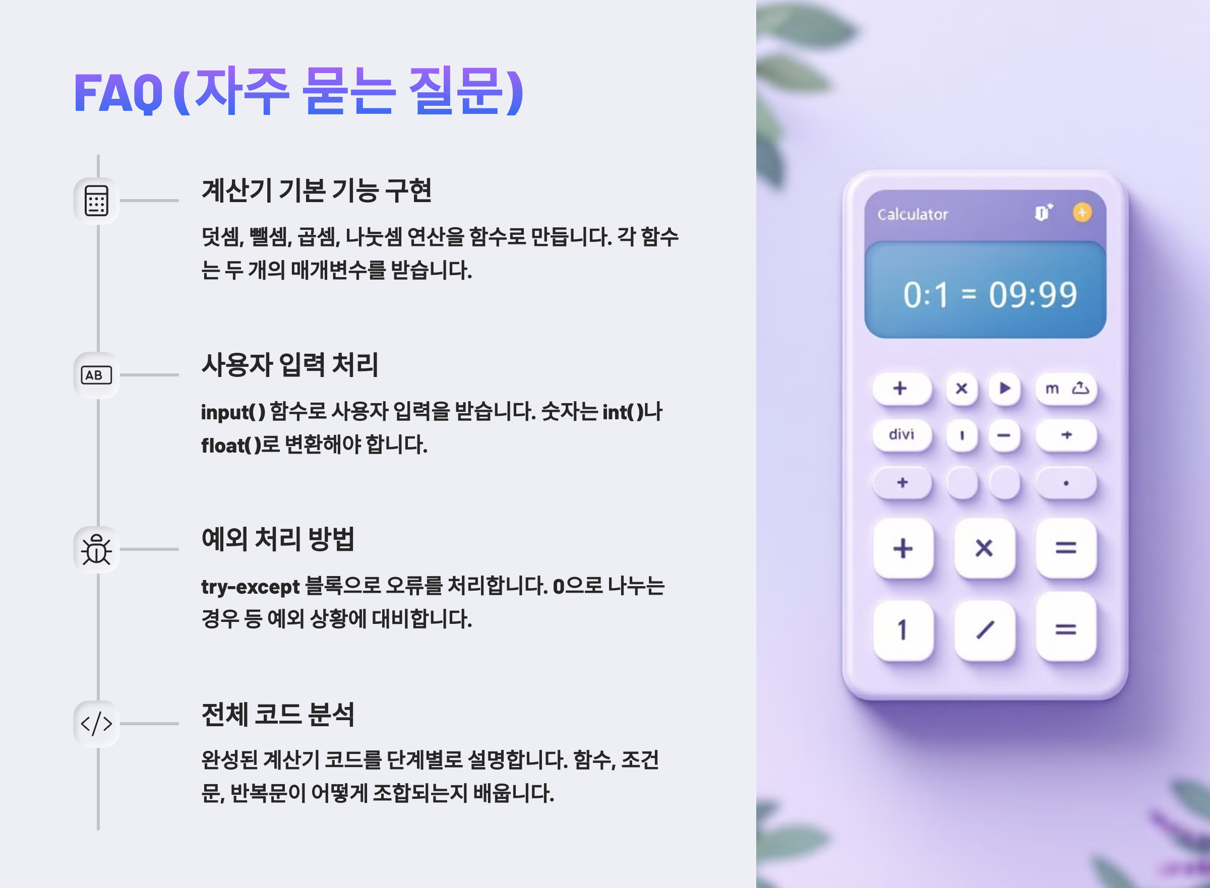 👀 사용자가 원하는 연산을 정확하게 수행하고, 0으로 나누기 같은 오류도 처리해주는 기본기 충실한 예제예요!
