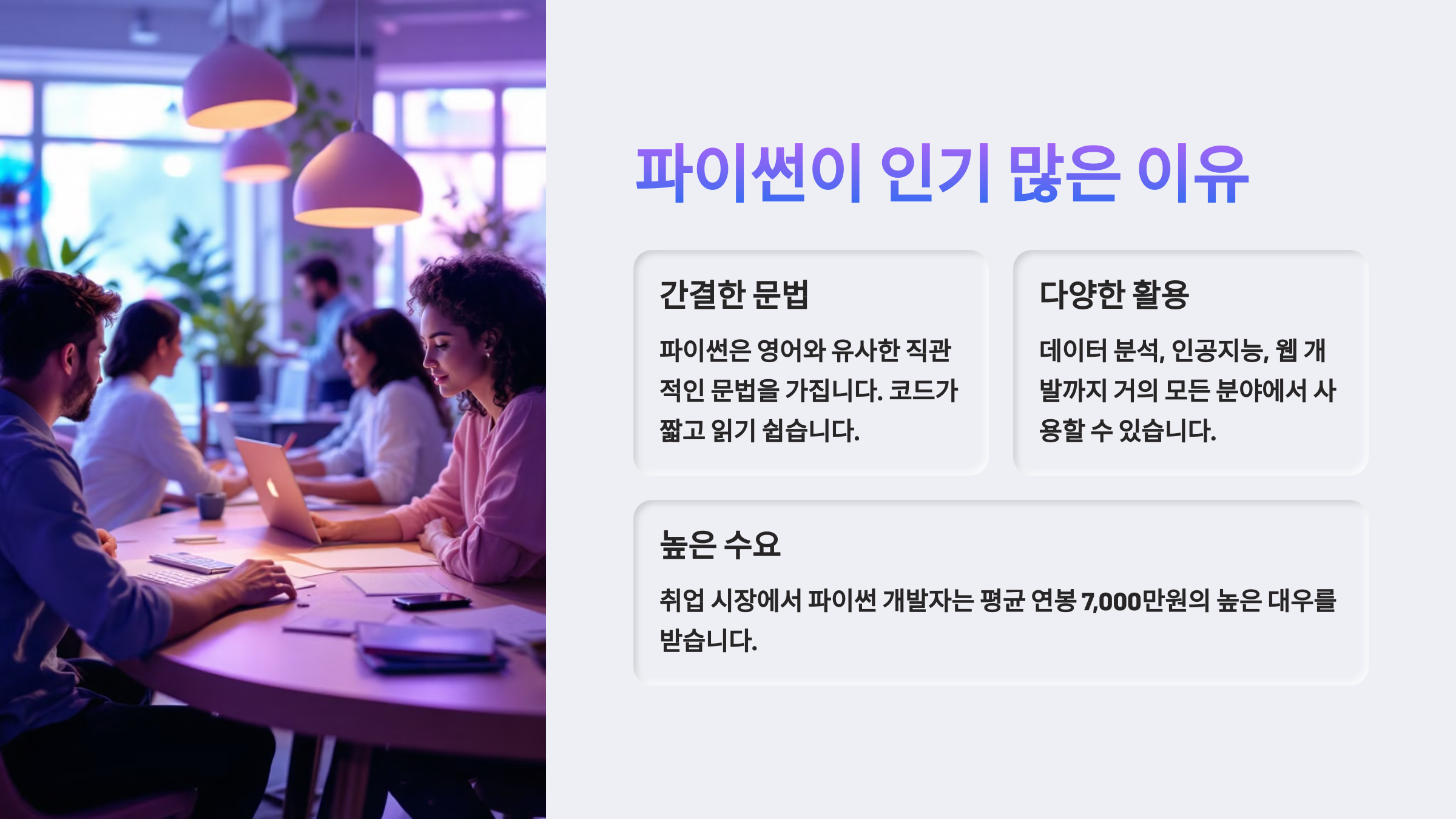 💬 파이썬은 가장 배우기 쉬운 프로그래밍 언어로 유명해요. 문법도 간단하고, 웹 개발, 데이터 분석, AI, 자동화까지 가능하니까 처음 배우는 사람에게 딱이에요!