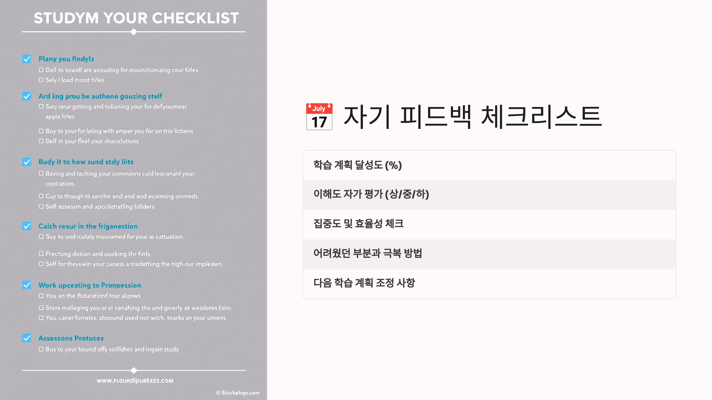 📅 자기주도 학습을 효과적으로 하기 위해서는 체계적인 피드백이 필요해요. 아래 체크리스트를 활용해 자신의 학습을 점검해보세요!