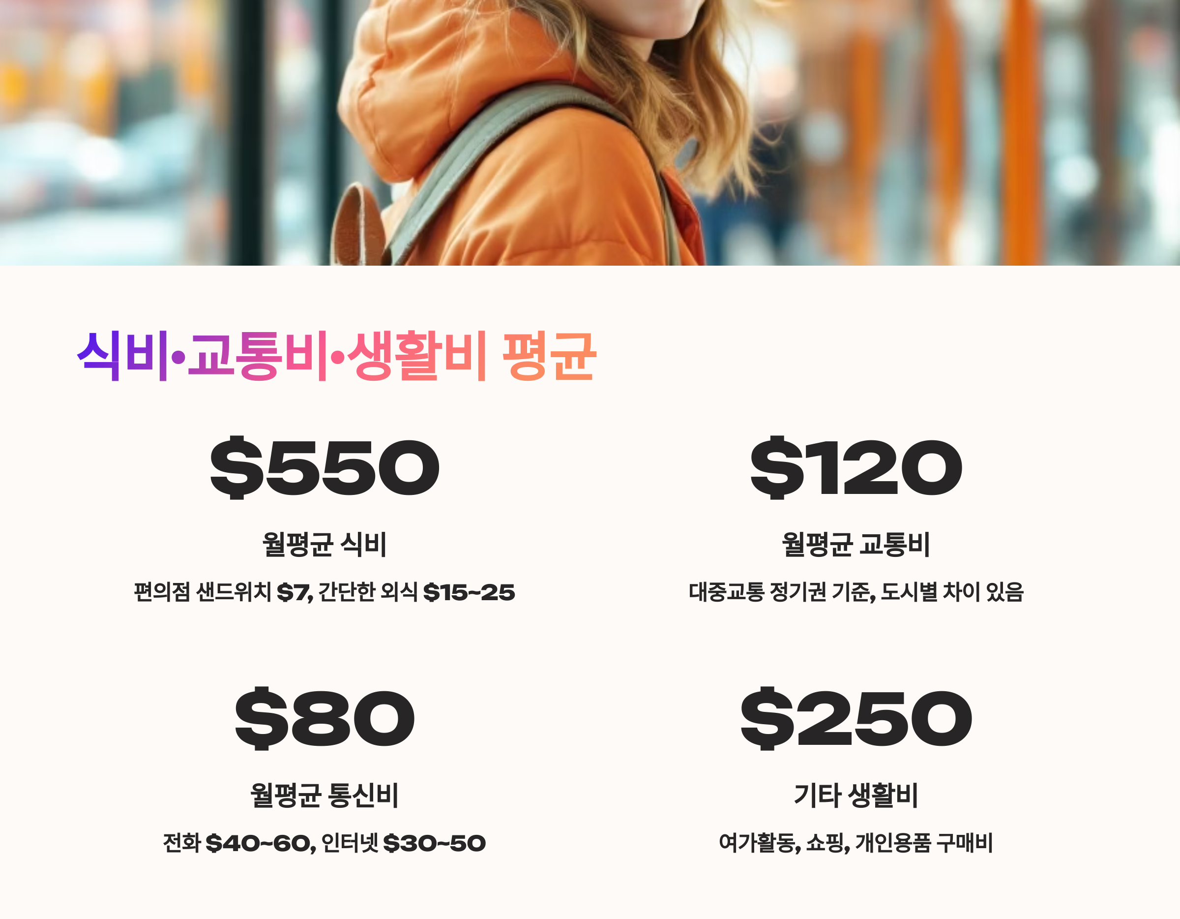 ✔ 생활비는 지출 조절이 가능한 항목이기 때문에 예산에 따라 월 400달러~800달러 수준에서 관리할 수 있어요! 🎯