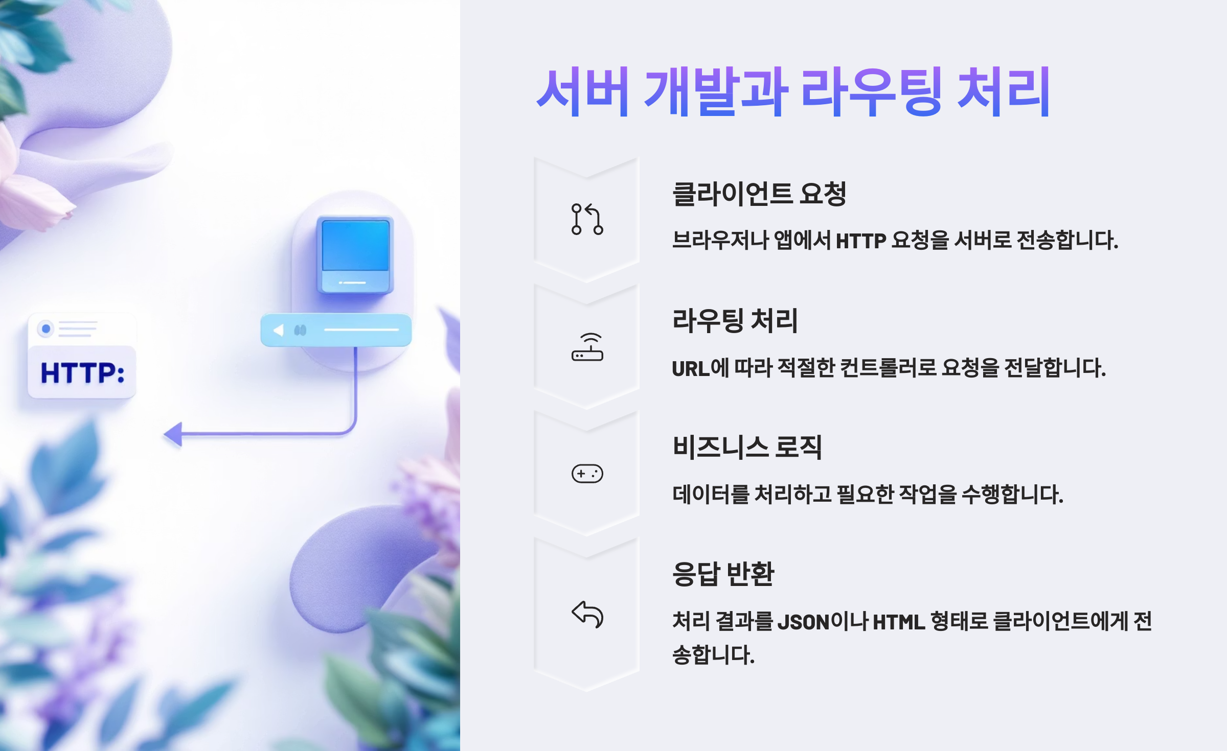 🔍 이런 방식은 모든 백엔드 프레임워크에 존재해요. Django에선 View, Spring에선 Controller로 처리되죠. 각각의 URL에 대해 어떤 함수가 작동할지를 매핑해주는 거예요.