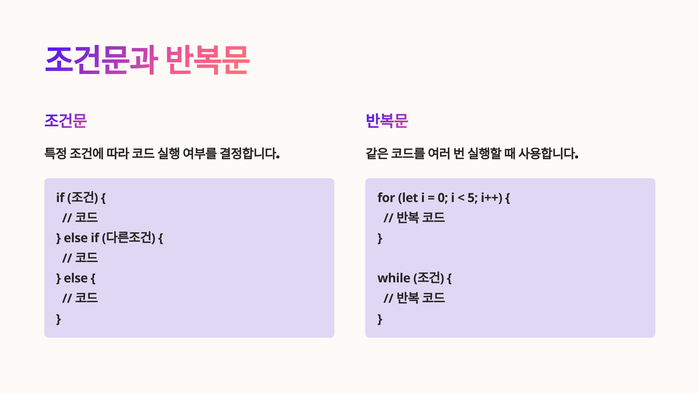 🔁 자바스크립트에서 조건문과 반복문은 프로그램의 흐름을 제어하는 데 사용돼요. 어떤 조건일 때만 코드가 실행되거나, 특정 작업을 여러 번 반복하고 싶을 때 반드시 필요하죠! 🧭