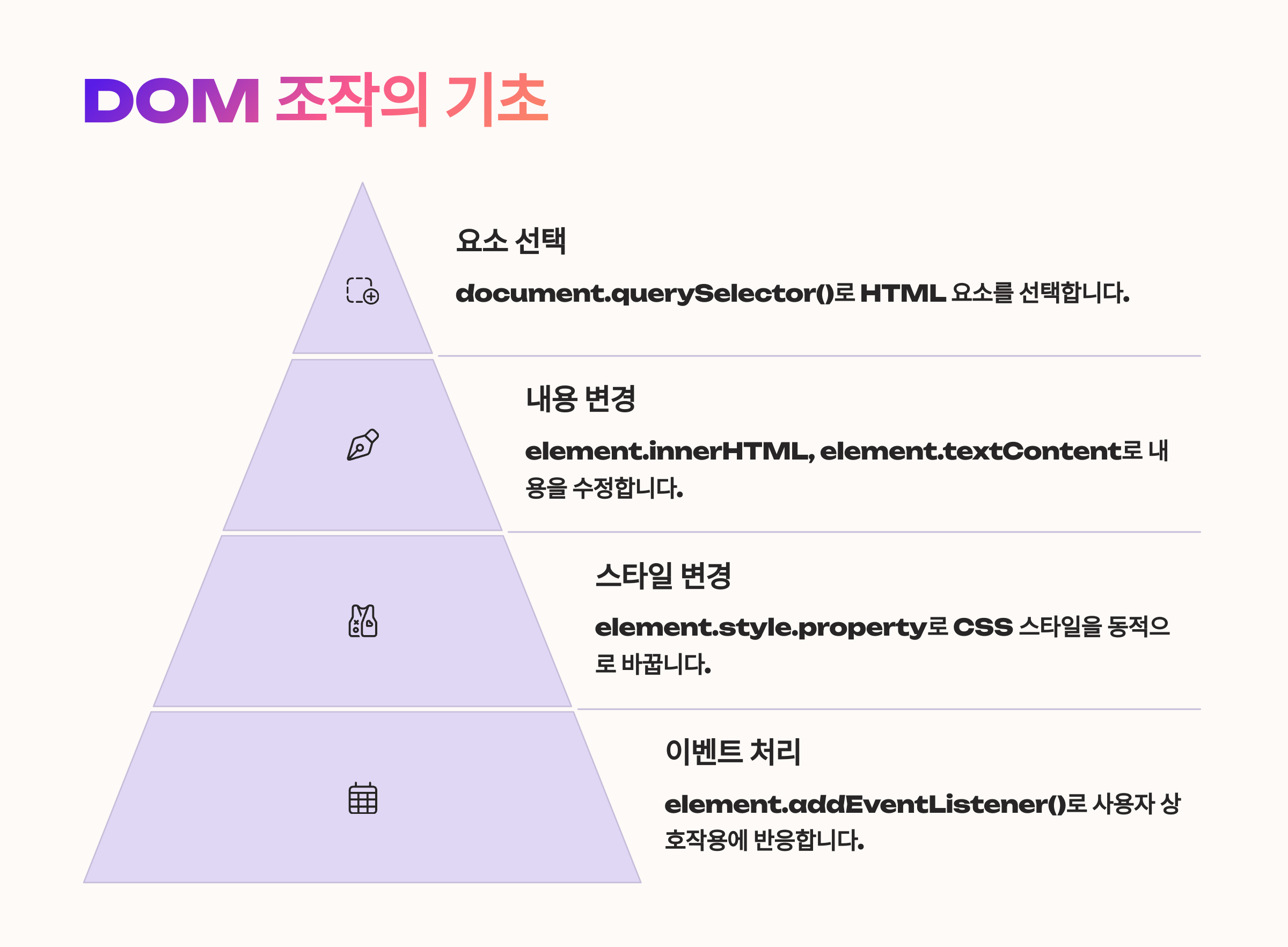 정리하자면, DOM 조작은 실제 웹페이지의 화면을 제어하는 핵심 기술이에요. 지금까지 배운 조건문, 함수, 이벤트와 조합하면 아주 다양한 UI를 만들 수 있답니다! 🎉