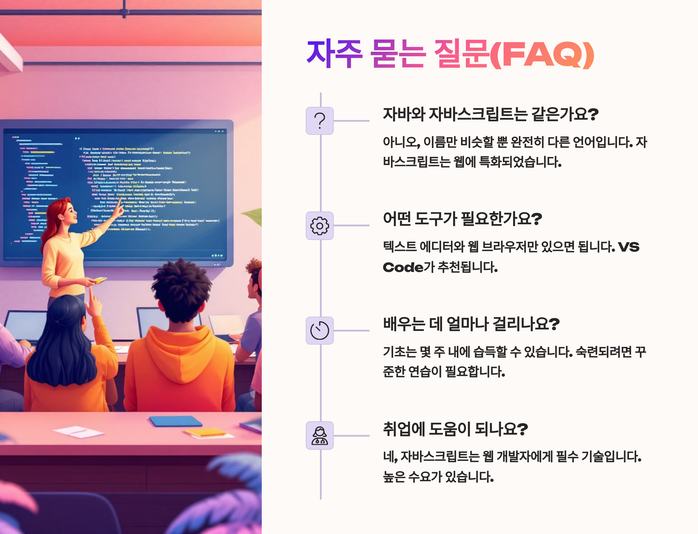 이제 자바스크립트 기초의 마지막 단계! ❓ 자주 묻는 질문(FAQ) 섹션으로 넘어갈게요! 💬🧠