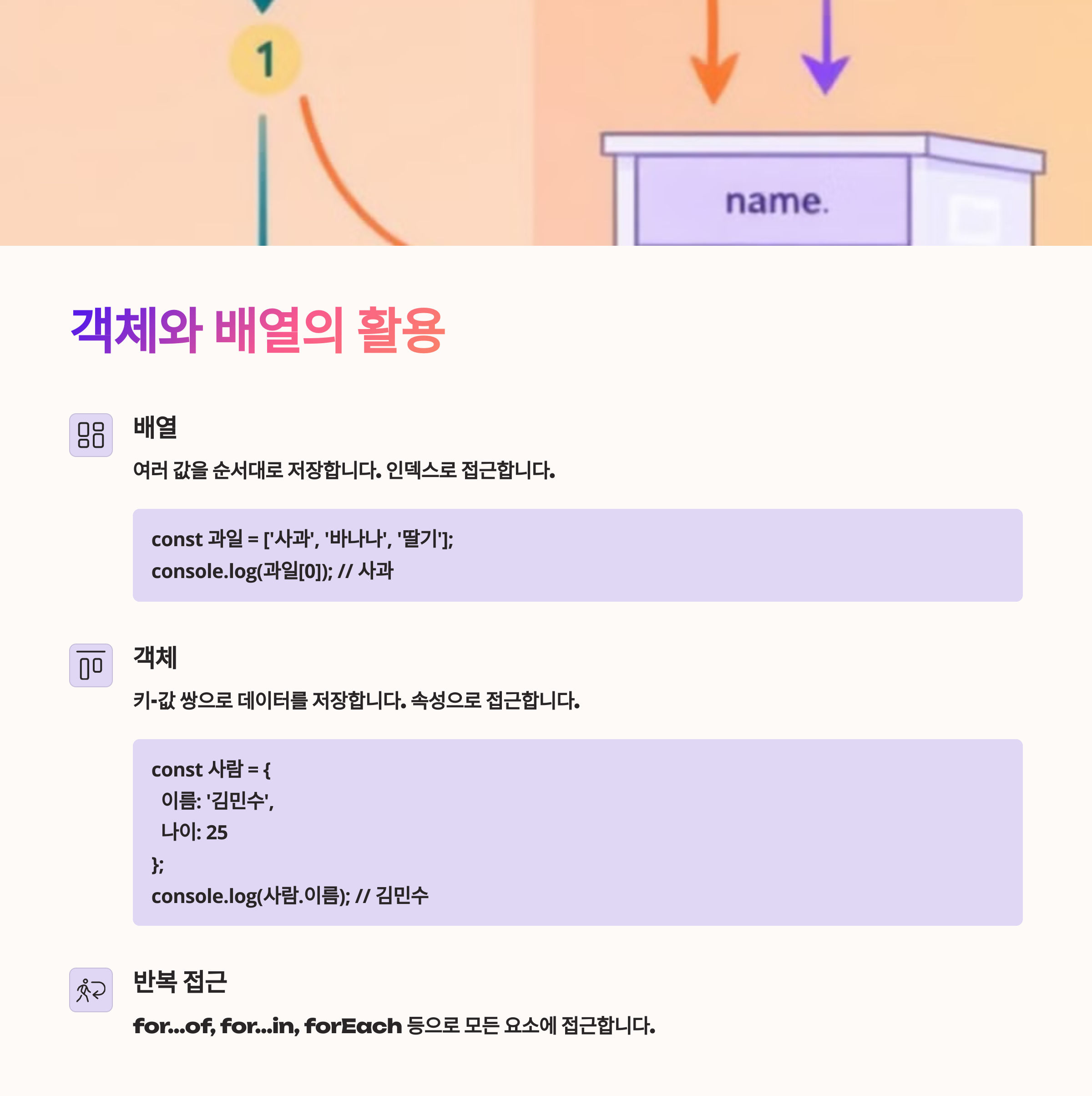 • 🧱 객체와 배열로 복잡한 데이터를 구조화하고,