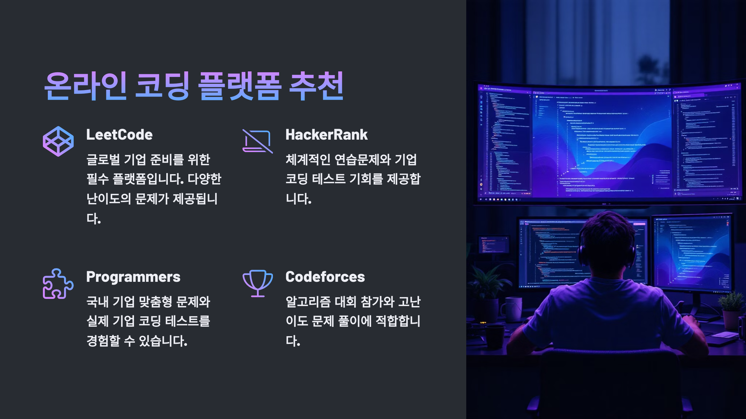 대표적인 플랫폼으로는 프로그래머스, 백준, LeetCode가 있어요. 각각 출제 스타일과 난이도가 다르기 때문에 자신의 레벨에 맞게 골라 푸는 것이 중요해요! 🎯
